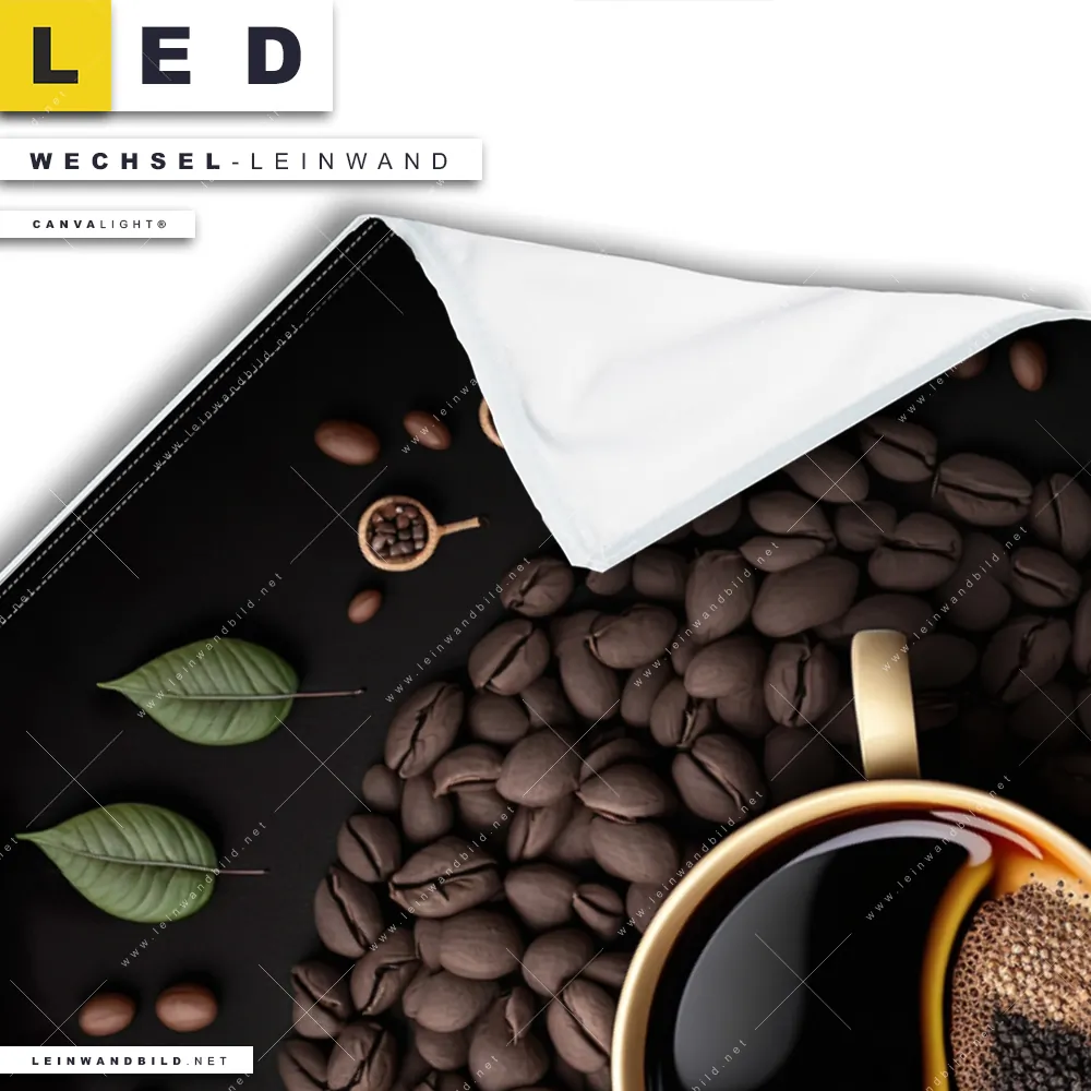LED Wechsel-Leinwand Canvalight® TEX | Kaffee mit Blattdekoration | Hochformat