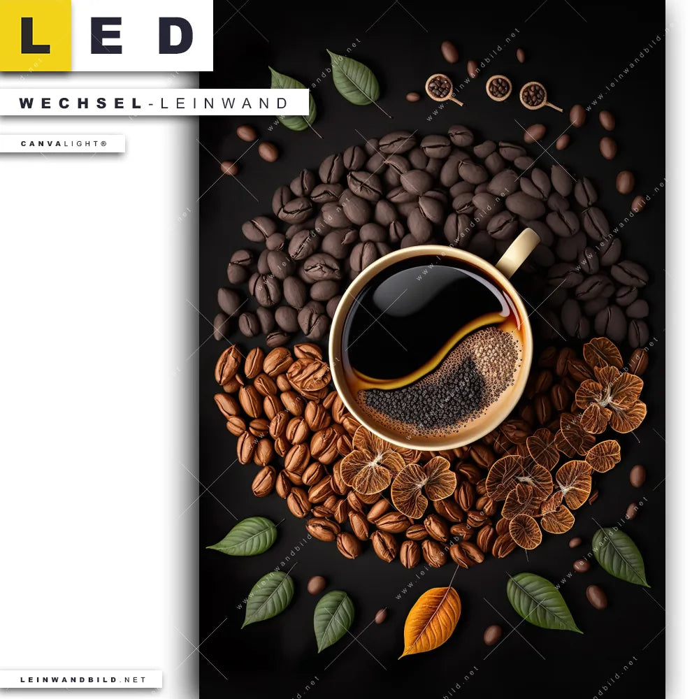 Du bist auf der Suche nach einer Essen - Trinken Wechsel-Leinwand für Dein LED-Leinwandbild im Hochformat? Begriffe wie Kaffee, Coffee, Küche, Kaffebohnen, Blätter, Tasse haben Dich auf der Suche nach Deiner Ersatz-Leinwand für dein LED Wandbild mit wechselbarer Leinwand inspiriert? Farben wie Braun, Grün, Orange dürfen auf Deinem neuen Wechselmotiv für Dein XXL Leinwand-LED-Bild nicht fehlen und Leinwände im Modern Art, Floral Stil für Leuchtbilder passen perfekt zu Deinem Einrichtungsstil?