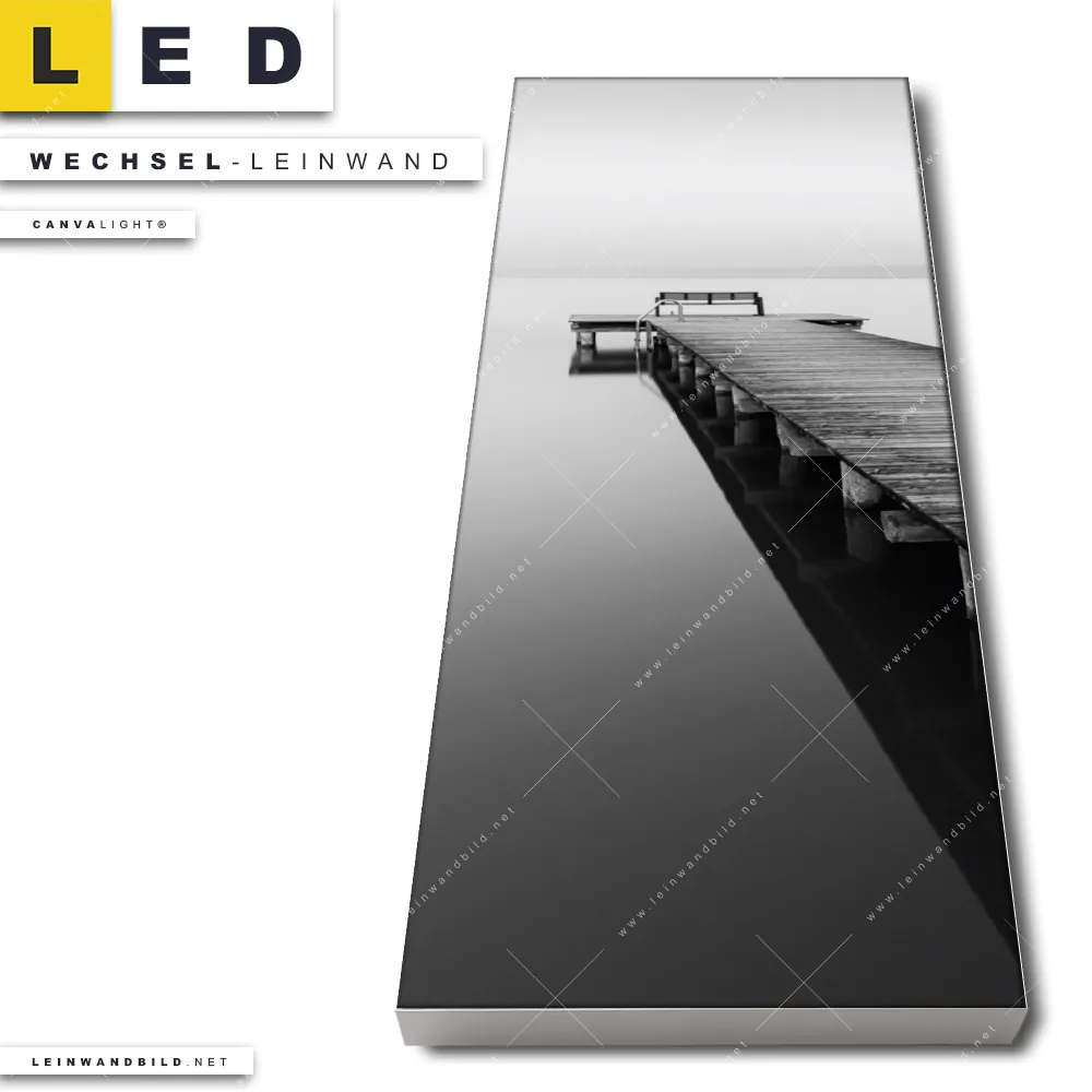 Dann sollte die Wechsel-Leinwand Canvalight® TEX | Kalter Morgen am Meer | Schmal den Weg zu Dir finden. Die Austausch-Leinwand Steg ins Meer scchwarz-weiß - passend für unsere stufenlos dimmbaren, steckerfertigen Leinwandbilder im LED Leuchtrahmen mit Fernbedienung und optionaler Farbtemperatursteuerung - fügt sich als Eye-Catcher harmonisch in jedes Wohnzimmer - Schlafzimmer, Büro - Kanzlei Raumkonzept ein.