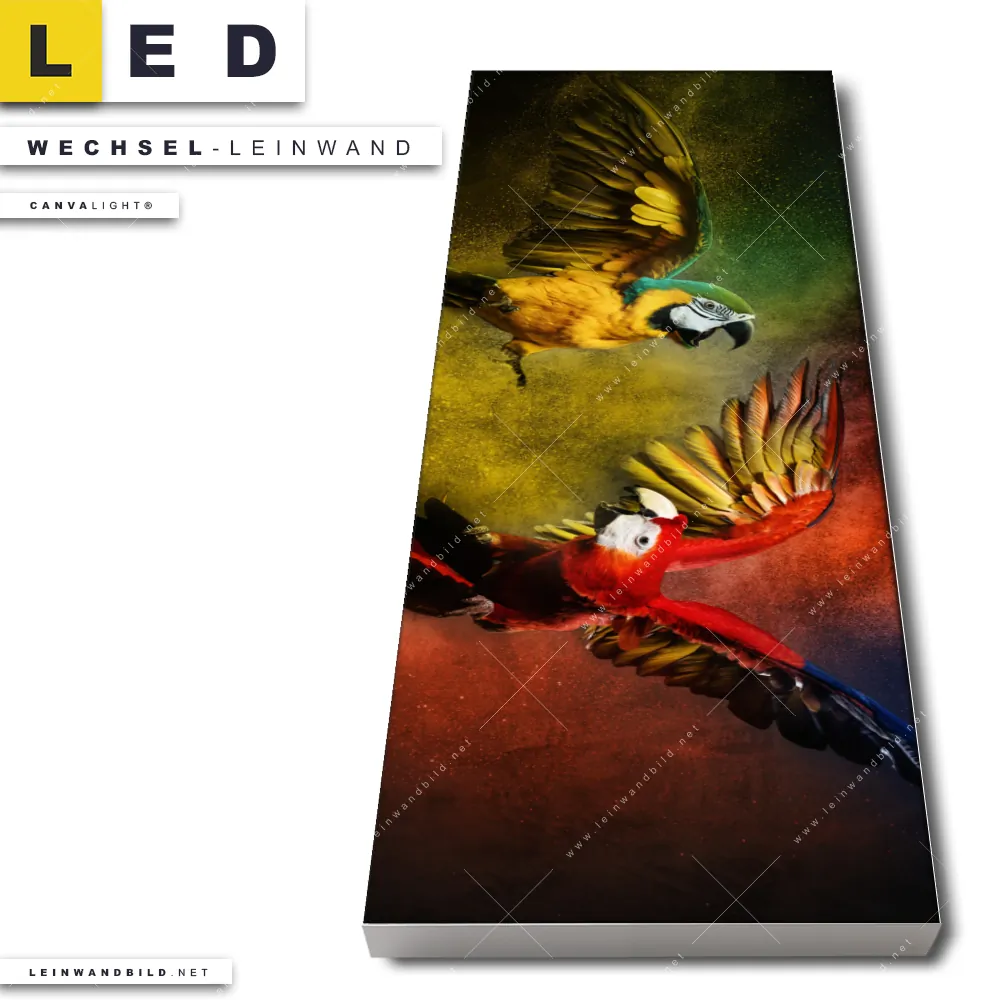 Du konfigurierst Deine individuelle LED Wechsel-Leinwand Canvalight® TEX | Kampf der Papageien | Schmal und wir produzieren sie NEU für Dich. Unsere Tierwelt Austausch-Fotoleinwände für Canvalight® LED Bilder sind KEINE Lagerware. Du bist Dir unsicher, welches Motiv oder Format das richtige für dein individuelles LED Wechselmotiv auf Leinwand ist, dann helfen wir dir gerne weiter und beraten dich!