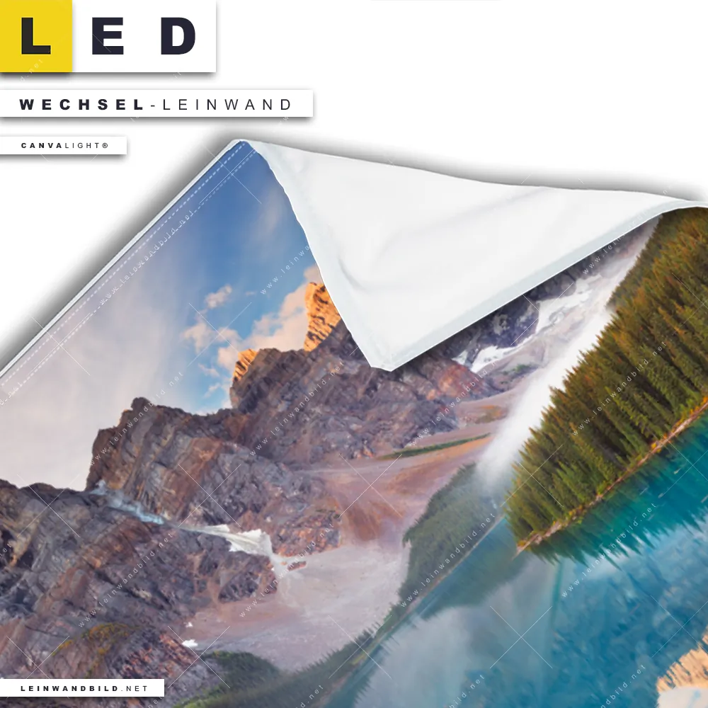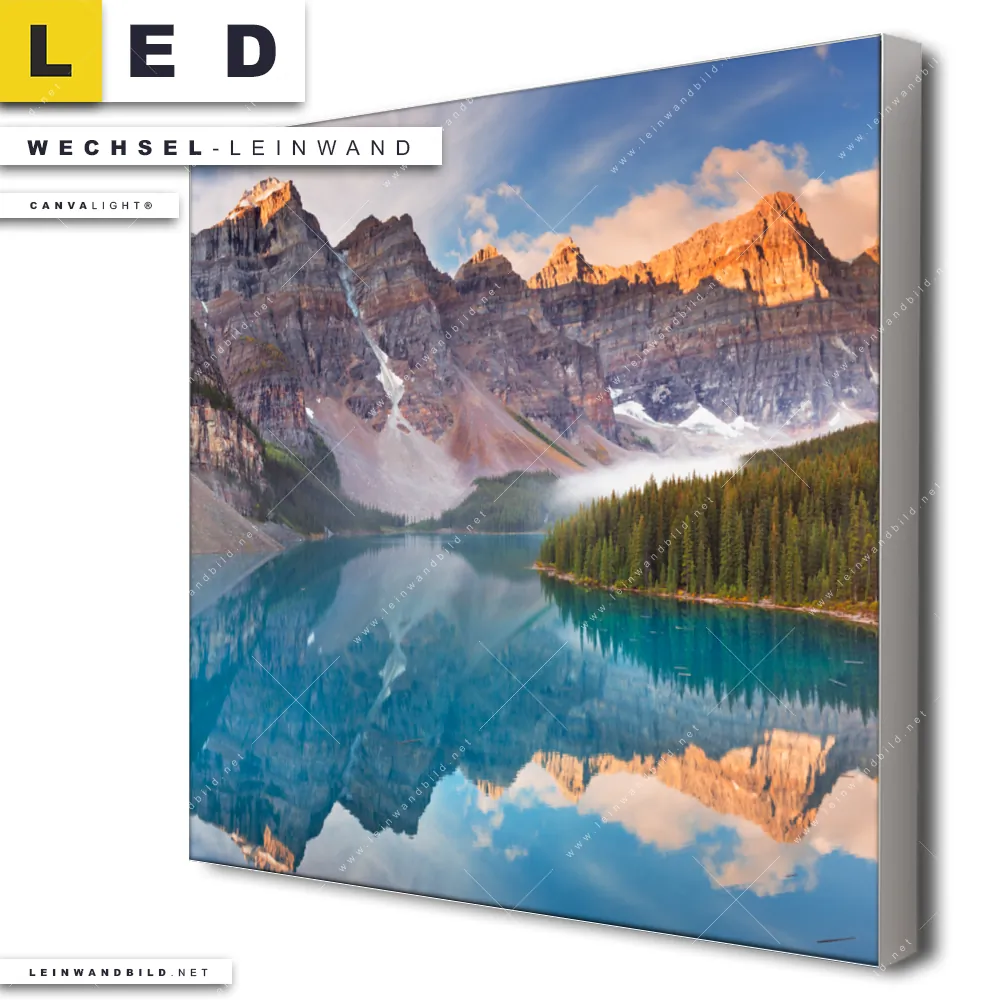 Du konfigurierst Deine individuelle LED Wechsel-Leinwand Canvalight® TEX | Kanadischer Bergsee | Quadrat und wir produzieren sie NEU für Dich. Unsere Landschaften Austausch-Fotoleinwände für Canvalight® LED Bilder sind KEINE Lagerware. Du bist Dir unsicher, welches Motiv oder Format das richtige für dein individuelles LED Wechselmotiv auf Leinwand ist, dann helfen wir dir gerne weiter und beraten dich!