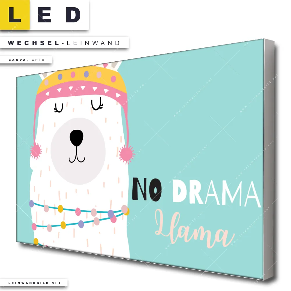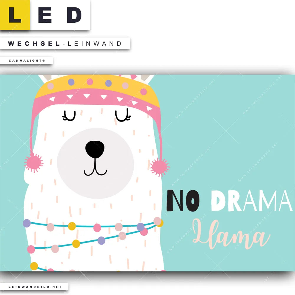 Dann sollte die Wechsel-Leinwand Canvalight® TEX | Kein Drama Lama | Querformat den Weg zu Dir finden. Die Austausch-Leinwand No Drama Lama - passend für unsere stufenlos dimmbaren, steckerfertigen Leinwandbilder im Leuchtrahmen mit Fernbedienung und optionaler Farbtemperatursteuerung - fügt sich als Eye-Catcher harmonisch in jedes Kinderzimmer, Friseur - Beauty, Arzt - Praxis Raumkonzept ein.