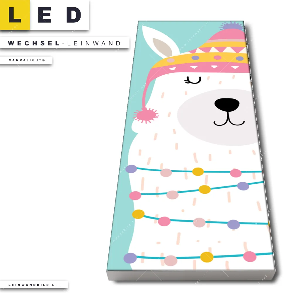 Du bist auf der Suche nach einer Tierwelt Wechsel-Leinwand für Dein LED-Leinwandbild im Schmalen Format? Begriffe wie Kinder, Tiere, Kunst, Freunde, Nachtlicht, träumen, Lama, Alpaka haben Dich auf der Suche nach Deiner Ersatz-Leinwand für dein LED Wandbild im Panorama-Hochformat mit wechselbarer Leinwand inspiriert? Farben wie Türkis, Rosa, Weiss, Orange dürfen auf Deinem neuen Wechselmotiv für Dein XXL Leinwand-LED-Bild nicht fehlen und Leinwände im Modern Art Stil für Leuchtbilder passen perfekt zu Deinem Einrichtungsstil?