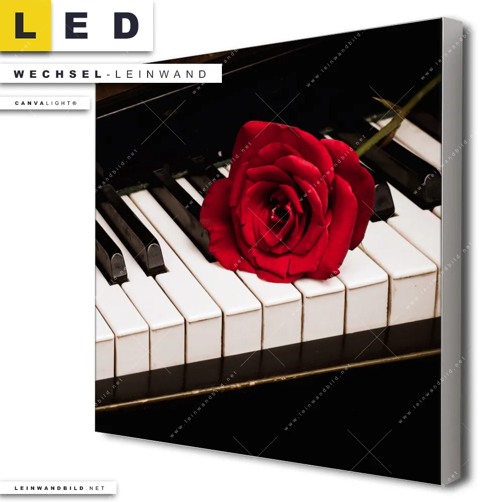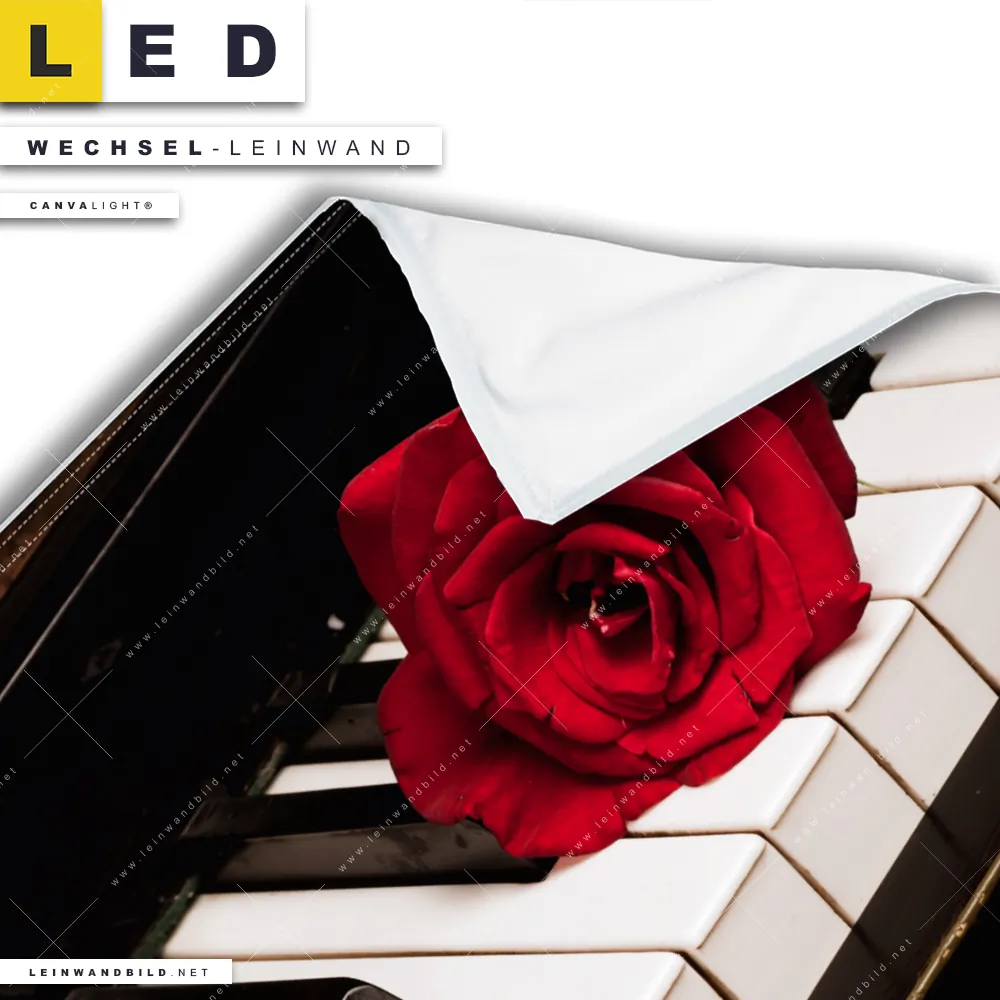 Dann sollte die Wechsel-Leinwand Canvalight® TEX | Klavier & Rose | Quadrat den Weg zu Dir finden. Die Austausch-Leinwand rote Rose auf Klaviatur - passend für unsere stufenlos dimmbaren, steckerfertigen Leinwandbilder im Leuchtrahmen mit Fernbedienung und optionaler Farbtemperatursteuerung - fügt sich als Eye-Catcher harmonisch in jedes Bar - Gastronomie, Büro - Kanzlei, Wohnzimmer - Schlafzimmer Raumkonzept ein.