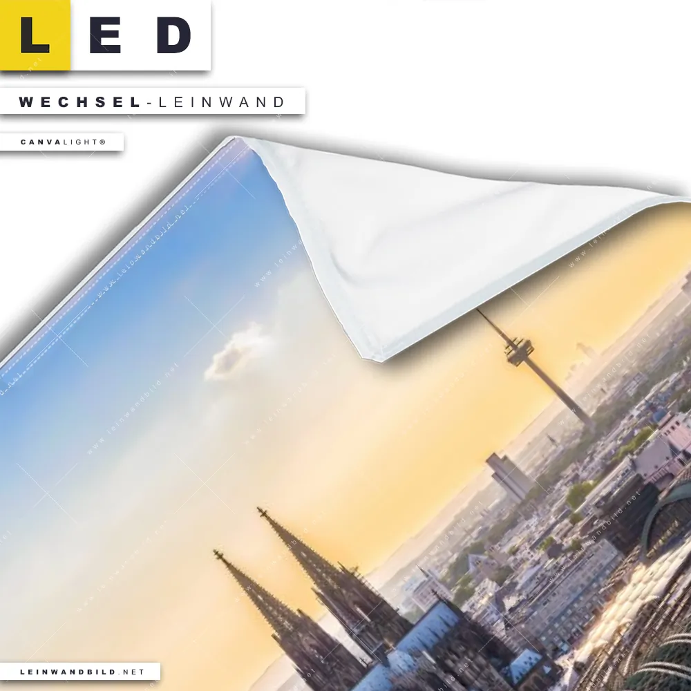 Bitte beachte, dass die Farben, der auf dem Monitor abgebildeten Köln an einem schönen Sommerabend Darstellung, möglicherweise von den Originalfarben deiner Canvalight® TEX Wechsel-Leinwand abweichen können.