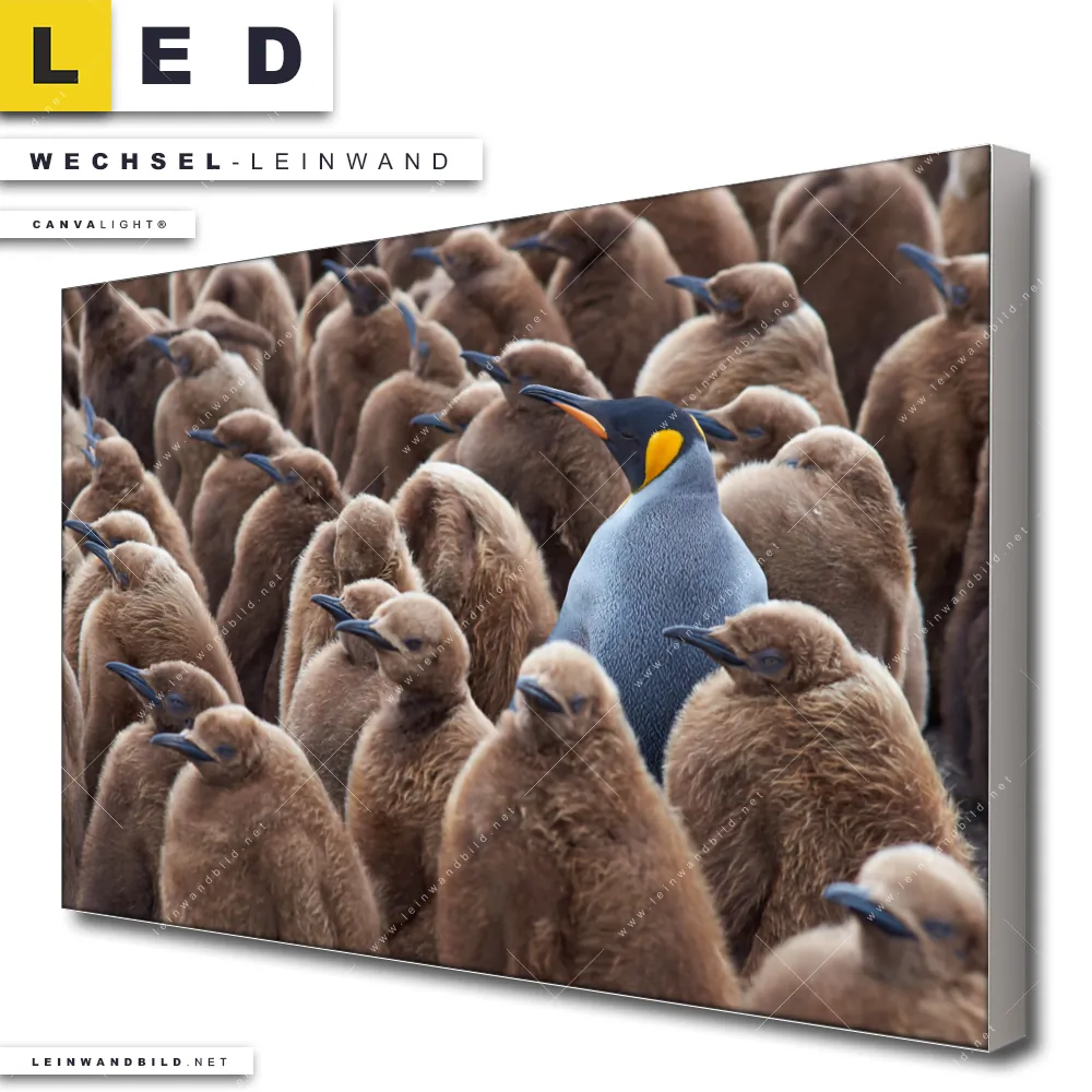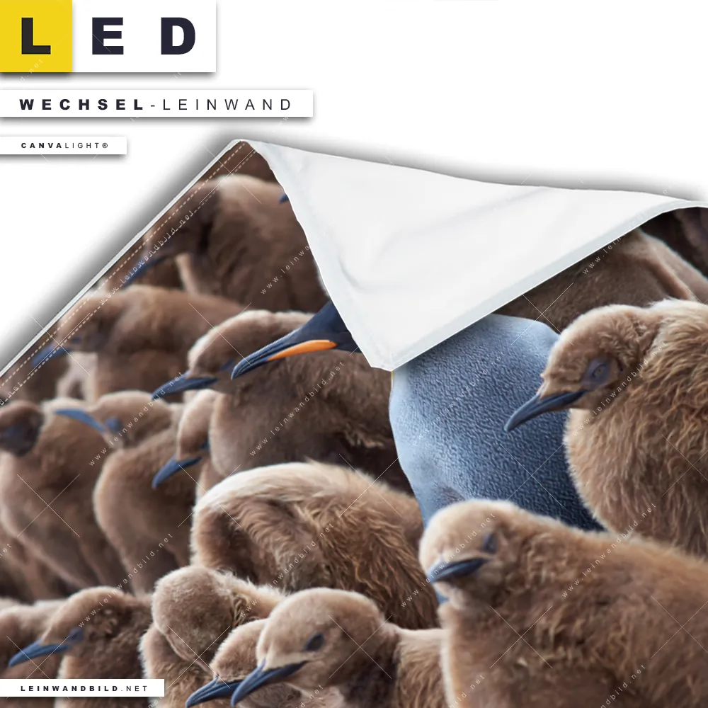 Du bist auf der Suche nach einer Tierwelt Wechsel-Leinwand für Dein LED-Leinwandbild im Querformat? Begriffe wie Vogel, Pinguin, Wasser, Eis, Königspinguine, Pinguinbabys, Kücken haben Dich auf der Suche nach Deiner Ersatz-Leinwand für dein breites LED Wandbild mit wechselbarer Leinwand inspiriert? Farben wie Braun dürfen auf Deinem neuen Wechselmotiv für Dein XXL Leinwand-LED-Bild nicht fehlen und Leinwände im Natürlich - Realistisch Stil für Leuchtbilder passen perfekt zu Deinem Einrichtungsstil?