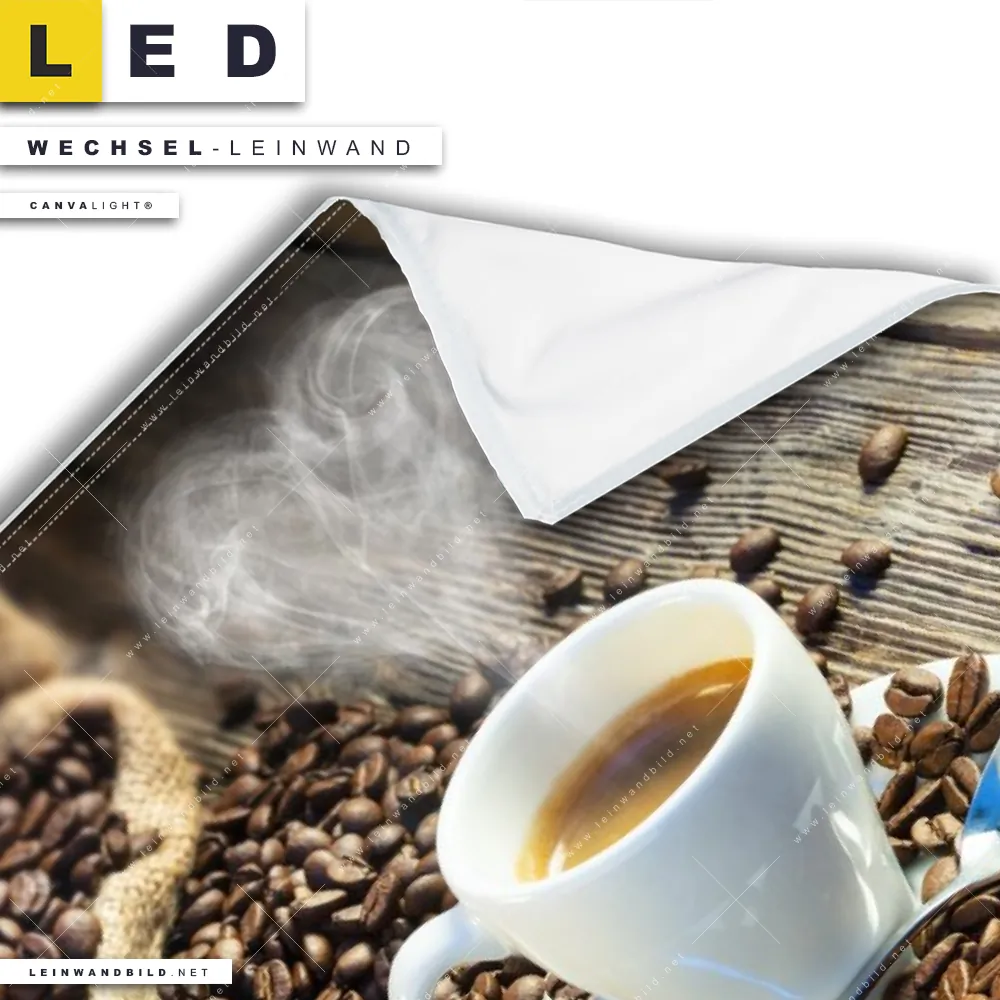 Dann sollte die Wechsel-Leinwand Canvalight® TEX | Köstlicher Kaffee | Quadrat den Weg zu Dir finden. Die Austausch-Leinwand Kaffee-Liebe - passend für unsere stufenlos dimmbaren, steckerfertigen Leinwandbilder im Leuchtrahmen mit Fernbedienung und optionaler Farbtemperatursteuerung - fügt sich als Eye-Catcher harmonisch in jedes Bar - Gastronomie, Küche - Esszimmer Raumkonzept ein.