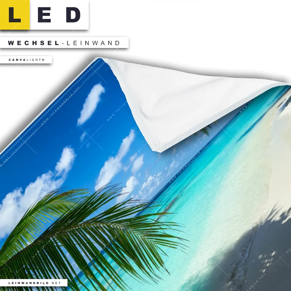 Du bist auf der Suche nach einer Landschaften, Strand - Meer Wechsel-Leinwand für Dein LED-Leinwandbild im Querformat? Begriffe wie Urlaub - Reisen, Südsee - Karibik, Sand, Ozean, Wasser, Küste, Horizont, Palmen, Sommer haben Dich auf der Suche nach Deiner Ersatz-Leinwand für dein breites LED Wandbild mit wechselbarer Leinwand inspiriert? Farben wie Blau, Türkis, Grün dürfen auf Deinem neuen Wechselmotiv für Dein XXL Leinwand-LED-Bild nicht fehlen und Leinwände im Natürlich - Realistisch Stil für Leuchtbilder passen perfekt zu Deinem Einrichtungsstil?