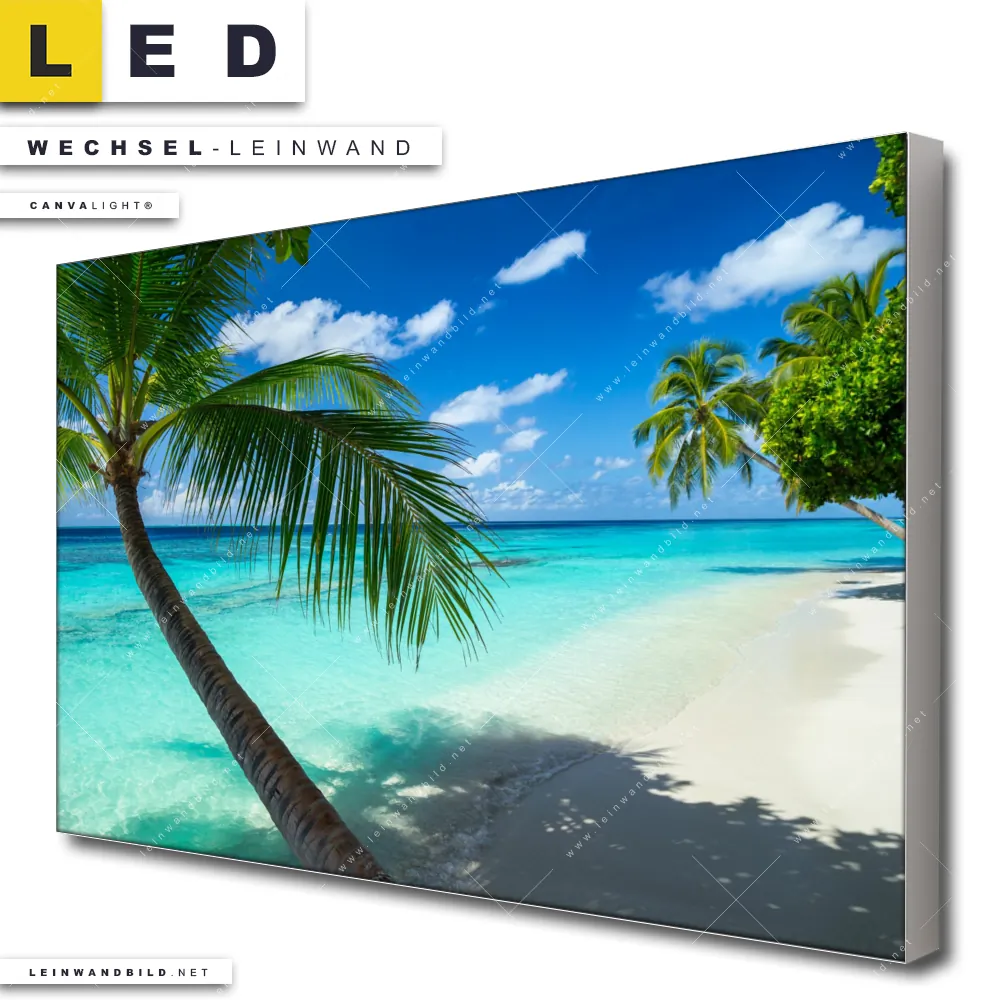 LED Wechsel-Leinwand Canvalight® TEX | Kokospalme am Strand | Querformat