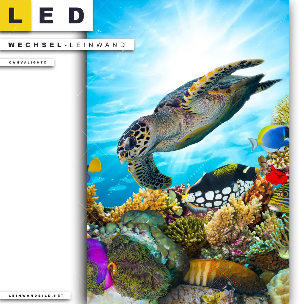 Du bist auf der Suche nach einer Strand - Meer, Tierwelt Wechsel-Leinwand für Dein LED-Leinwandbild im Hochformat? Begriffe wie Ozean, Wasser, Wellen, Unterwasserwelt, Korallenriff, Korallen, Schildkröte, Riff, schnorcheln, tauchen, Urlaub - Reisen, Fisch, Meeresbewohner haben Dich auf der Suche nach Deiner Ersatz-Leinwand für dein LED Wandbild mit wechselbarer Leinwand inspiriert? Farben wie Blau, Bunt dürfen auf Deinem neuen Wechselmotiv für Dein XXL Leinwand-LED-Bild nicht fehlen und Leinwände im Natürlich - Realistisch Stil für Leuchtbilder passen perfekt zu Deinem Einrichtungsstil?