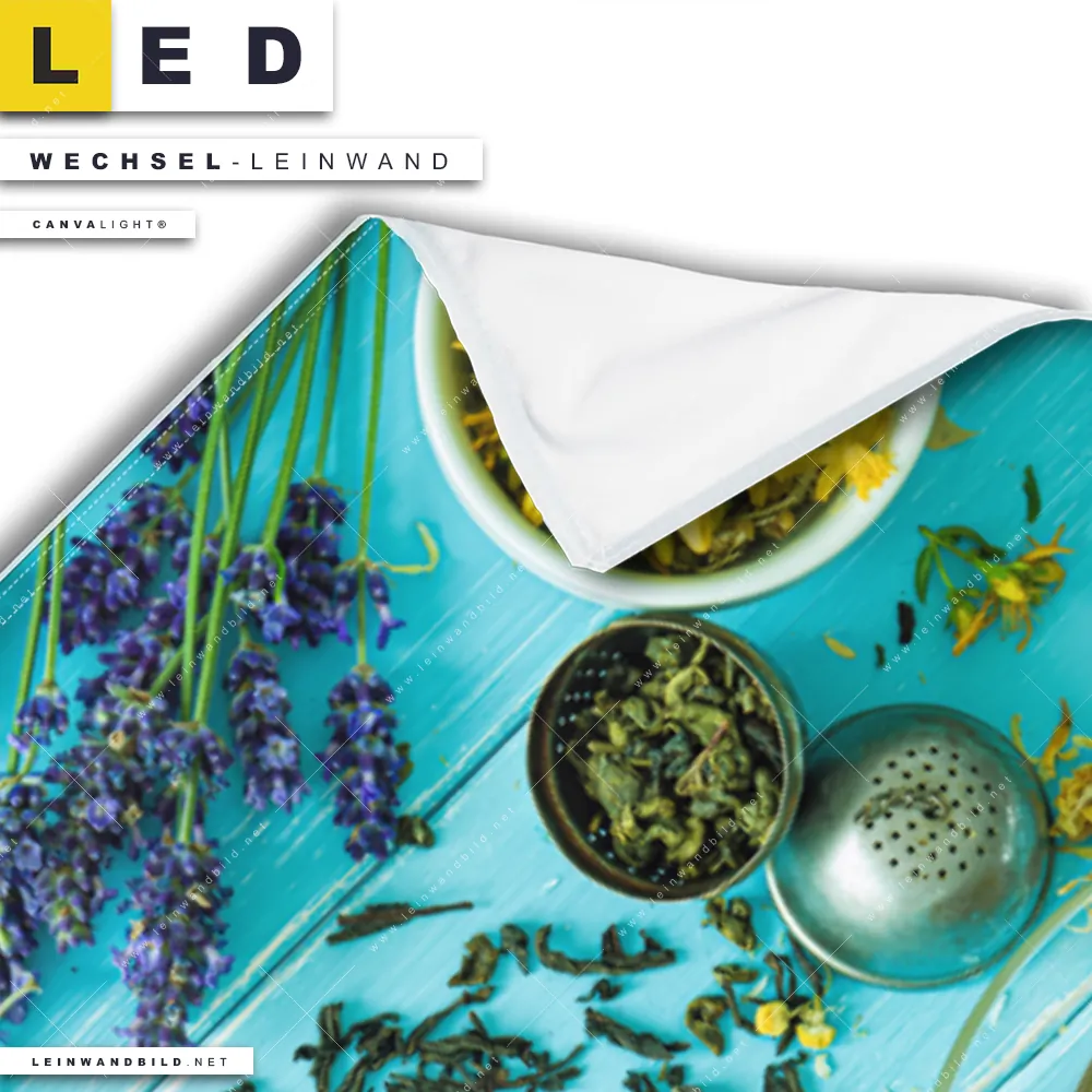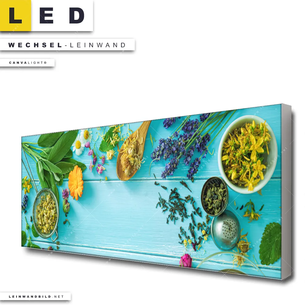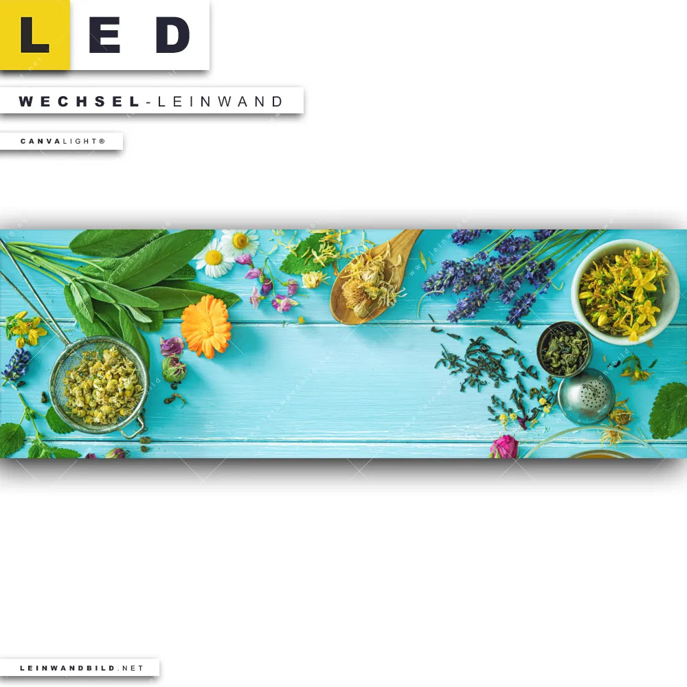 Du bist auf der Suche nach einer Essen - Trinken, Blumen - Botanik Wechsel-Leinwand für Dein LED-Leinwandbild im Panorama-Format? Begriffe wie Kräuter, Blumen, Blüten, Minze, Salbei, Kamille, Lavendel haben Dich auf der Suche nach Deiner Ersatz-Leinwand für dein extra breites LED Wandbild mit wechselbarer Leinwand inspiriert? Farben wie Grün, Hellblau, Blau, Türkis dürfen auf Deinem neuen Wechselmotiv für Dein XXL Leinwand-LED-Bild nicht fehlen und Leinwände im Natürlich - Realistisch, Retro - Vintage Stil für Leuchtbilder passen perfekt zu Deinem Einrichtungsstil?