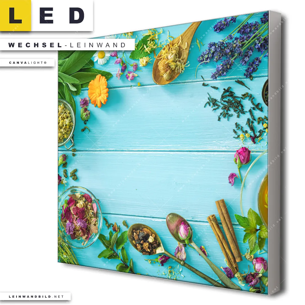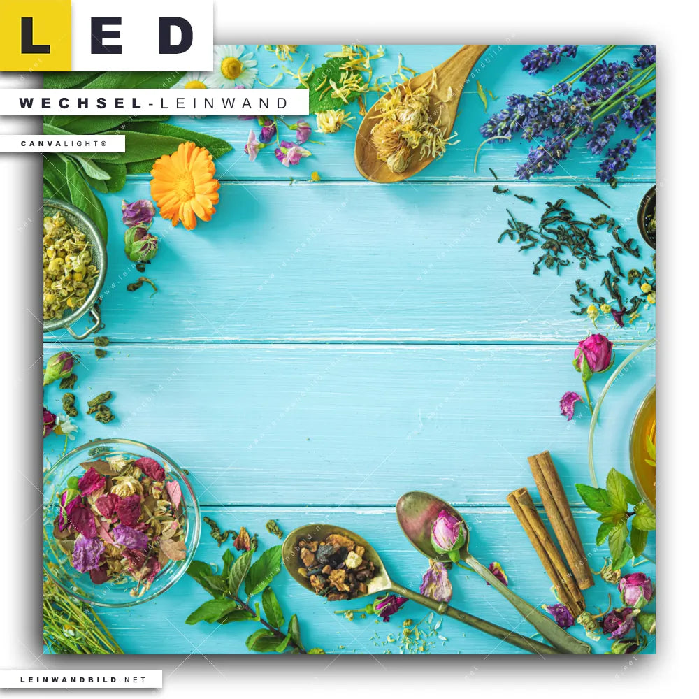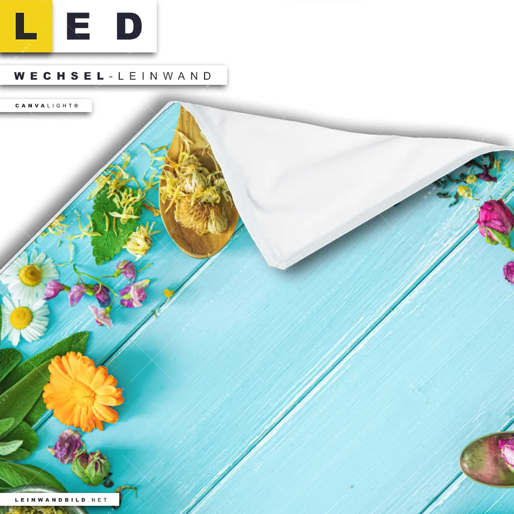 Dann sollte die Wechsel-Leinwand Canvalight® TEX | Kräuter auf blauem Holztisch | Quadrat den Weg zu Dir finden. Die Austausch-Leinwand getrocknete Blüten und Gewürze - passend für unsere stufenlos dimmbaren, steckerfertigen Leinwandbilder im Leuchtrahmen mit Fernbedienung und optionaler Farbtemperatursteuerung - fügt sich als Eye-Catcher harmonisch in jedes Bar - Gastronomie, Küche - Esszimmer Raumkonzept ein.