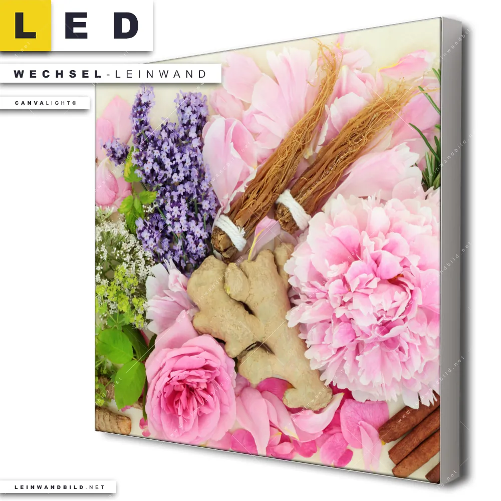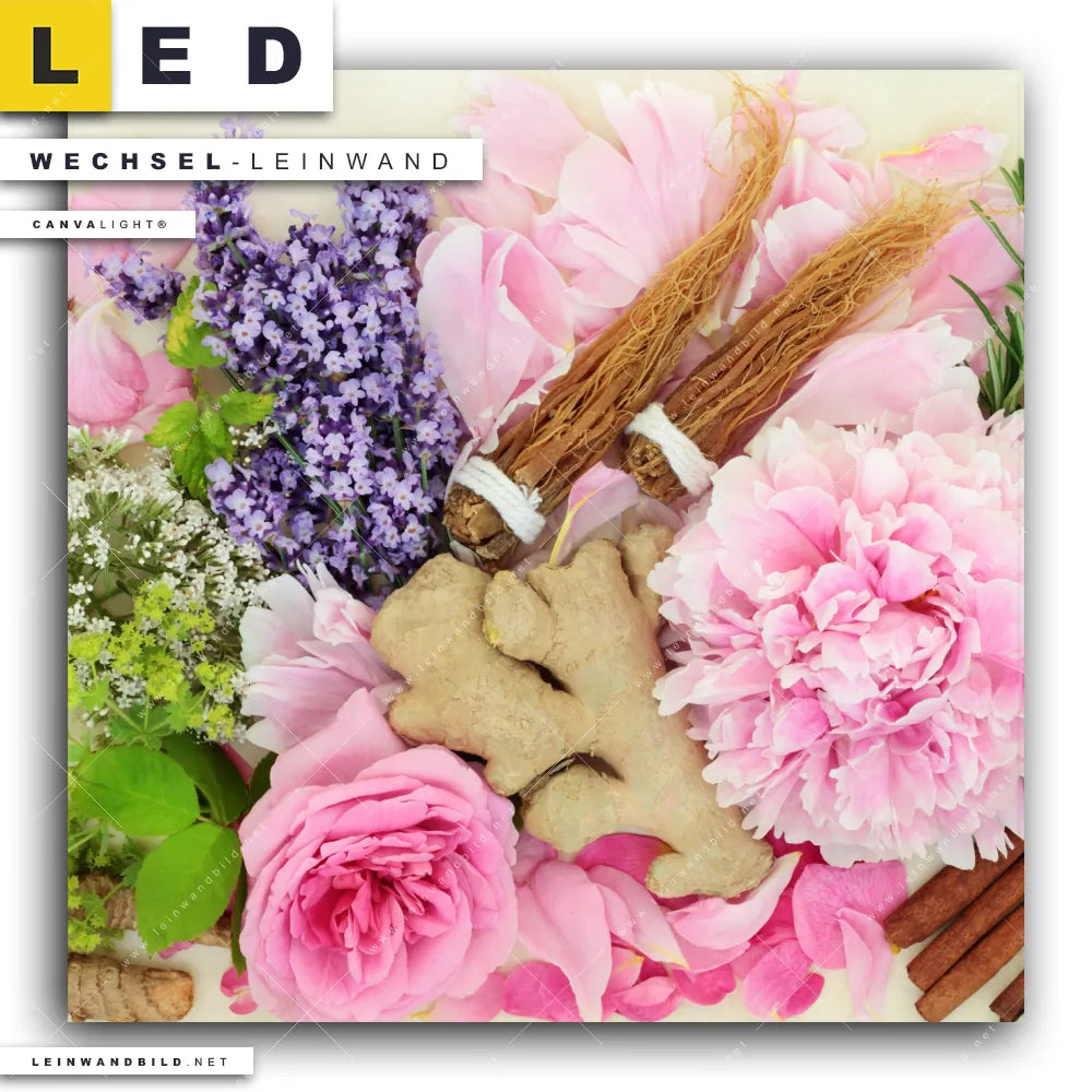 Du bist auf der Suche nach einer Essen - Trinken, Blumen - Botanik Wechsel-Leinwand für Dein LED-Leinwandbild im Quadratischen Format? Begriffe wie Gewürze, Kräuter, kochen, Pfeffer, Salz, Curry, Chili, Blumen, Blüten, Ingwer, Rosen haben Dich auf der Suche nach Deiner Ersatz-Leinwand für dein LED Wandbild mit wechselbarer Leinwand inspiriert? Farben wie Grün, Rosa, Lila, Pink, Braun, Beige dürfen auf Deinem neuen Wechselmotiv für Dein XXL Leinwand-LED-Bild nicht fehlen und Leinwände im Modern Art, Natürlich - Realistisch Stil für Leuchtbilder passen perfekt zu Deinem Einrichtungsstil?