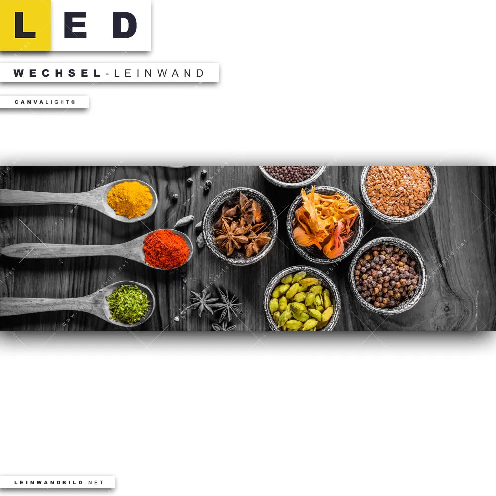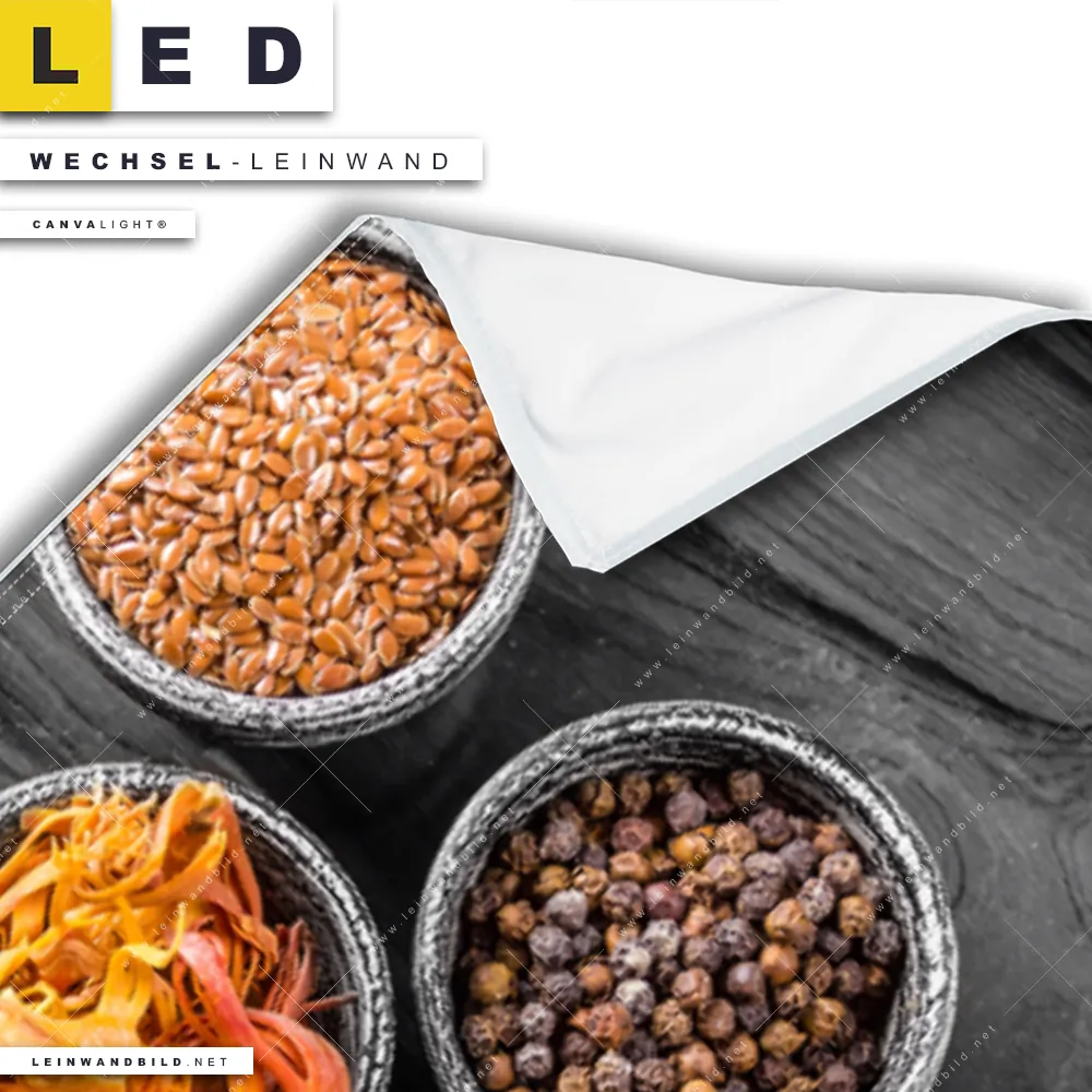 Du bist auf der Suche nach einer Essen - Trinken Wechsel-Leinwand für Dein LED-Leinwandbild im Panorama-Format? Begriffe wie Kräuter, Gewürze, Löffel, Besteck, kochen, Lebensmittel, Pulver, Körner haben Dich auf der Suche nach Deiner Ersatz-Leinwand für dein extra breites LED Wandbild mit wechselbarer Leinwand inspiriert? Farben wie Grün, Schwarz, Braun, Beige dürfen auf Deinem neuen Wechselmotiv für Dein XXL Leinwand-LED-Bild nicht fehlen und Leinwände im Natürlich - Realistisch, Modern Art Stil für Leuchtbilder passen perfekt zu Deinem Einrichtungsstil?
