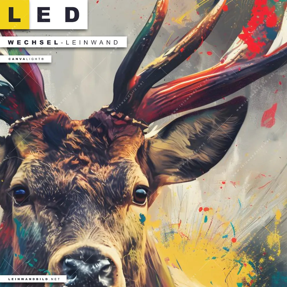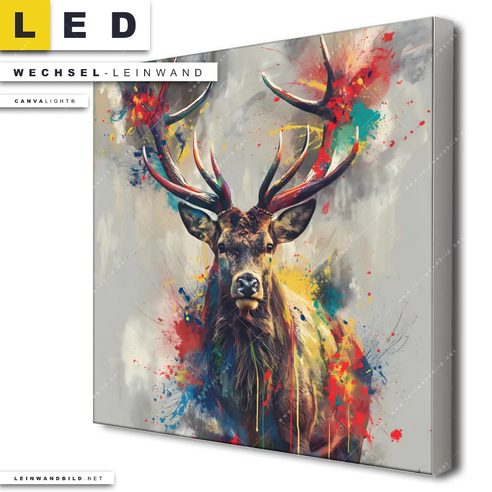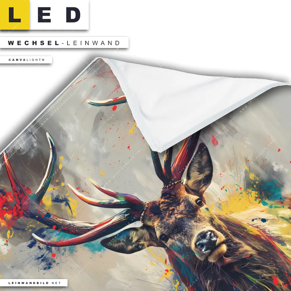 LED Wechsel-Leinwand Canvalight® TEX | Kreativer Hirsch mit Farbspritzern | Quadrat