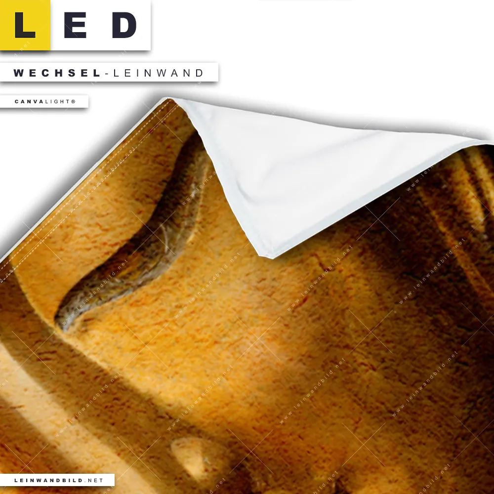 Bitte beachte, dass die Farben, der auf dem Monitor abgebildeten Buddha in Gold-Tönen Darstellung, möglicherweise von den Originalfarben deiner Canvalight® TEX Wechsel-Leinwand abweichen können.