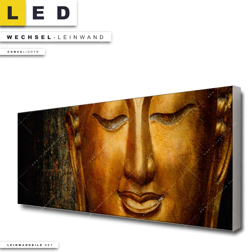 Dann sollte die Wechsel-Leinwand Canvalight® TEX | Lächelnder Buddha in Gold | Panorama den Weg zu Dir finden. Die Austausch-Leinwand Buddha Meditation - passend für unsere stufenlos dimmbaren, steckerfertigen Leinwandbilder im LED Leuchtrahmen mit Fernbedienung und optionaler Farbtemperatursteuerung - fügt sich als Eye-Catcher harmonisch in jedes Arzt - Praxis, Wohnzimmer - Schlafzimmer, Büro - Kanzlei, Friseur - Beauty Raumkonzept ein.
