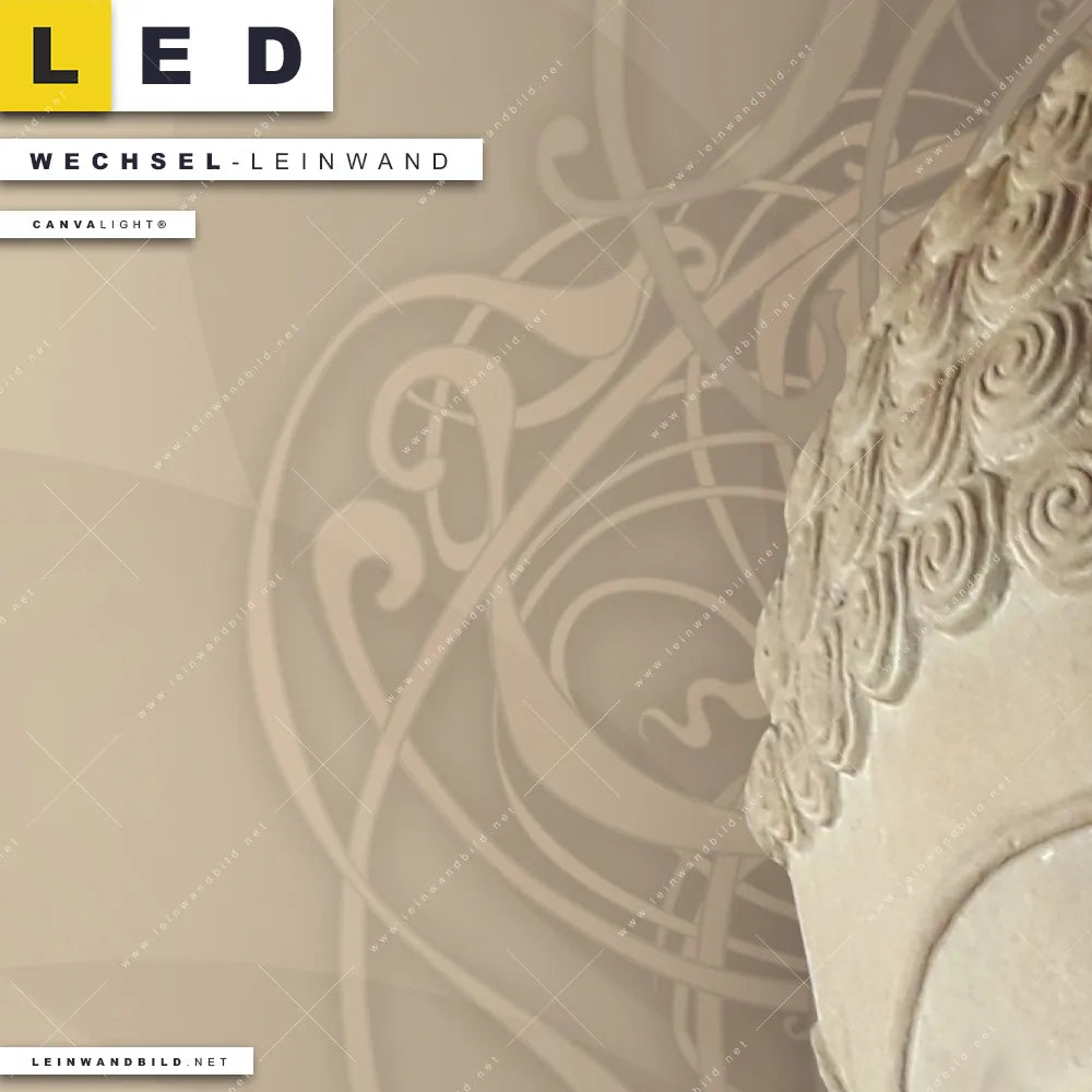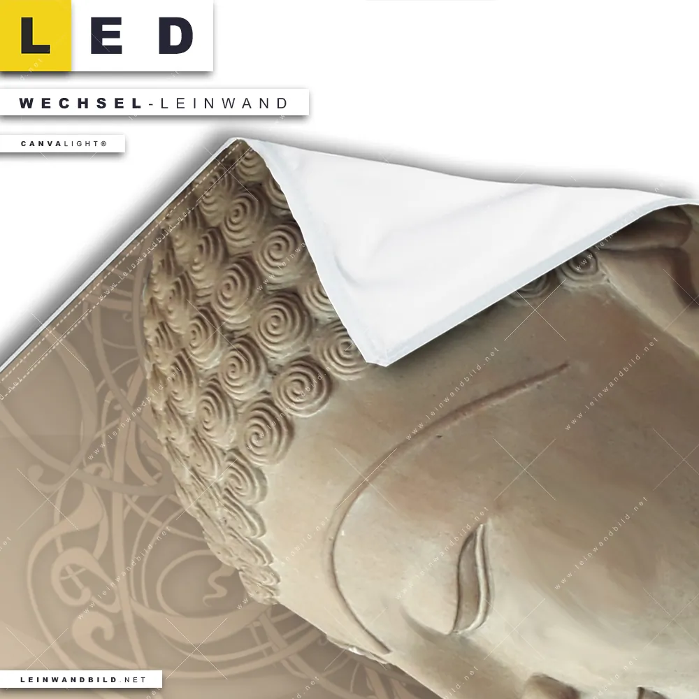 Bitte beachte, dass die Farben, der auf dem Monitor abgebildeten Buddha in Beige-Tönen Darstellung, möglicherweise von den Originalfarben deiner Canvalight® TEX Wechsel-Leinwand abweichen können.