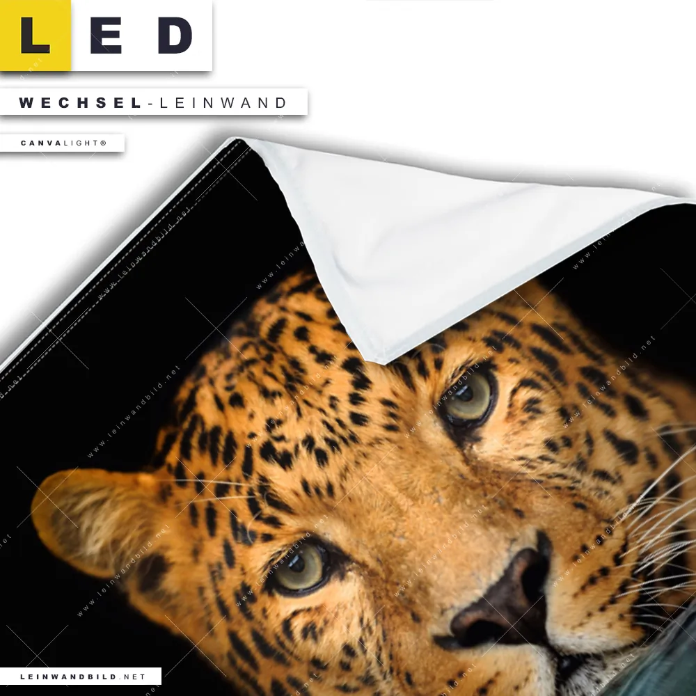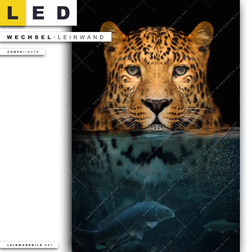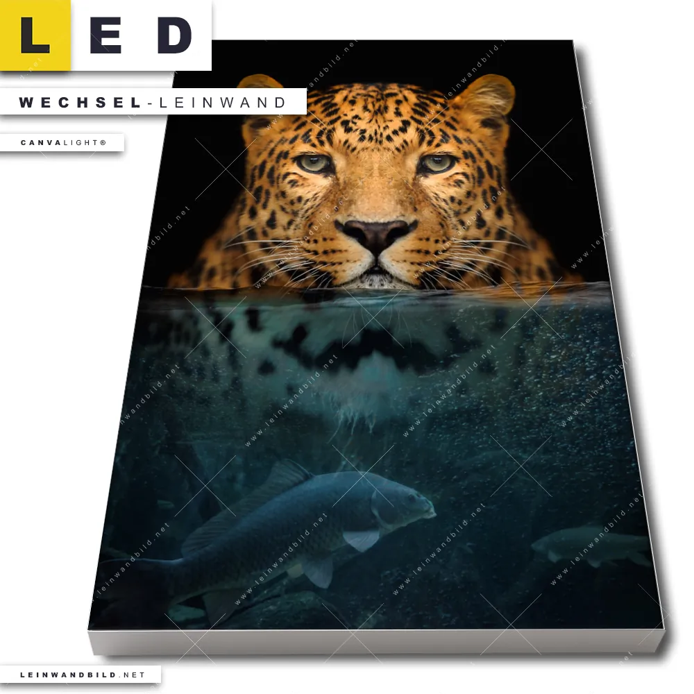 Du bist auf der Suche nach einer Tierwelt Wechsel-Leinwand für Dein LED-Leinwandbild im Hochformat? Begriffe wie Raubkatze, Leopard, Afrika, Dschungel, Wasser, wild, Safari, Unterwasser, Wildkatze haben Dich auf der Suche nach Deiner Ersatz-Leinwand für dein LED Wandbild mit wechselbarer Leinwand inspiriert? Farben wie Schwarz, Beige dürfen auf Deinem neuen Wechselmotiv für Dein XXL Leinwand-LED-Bild nicht fehlen und Leinwände im Modern Art, Mixed Media Stil für Leuchtbilder passen perfekt zu Deinem Einrichtungsstil?