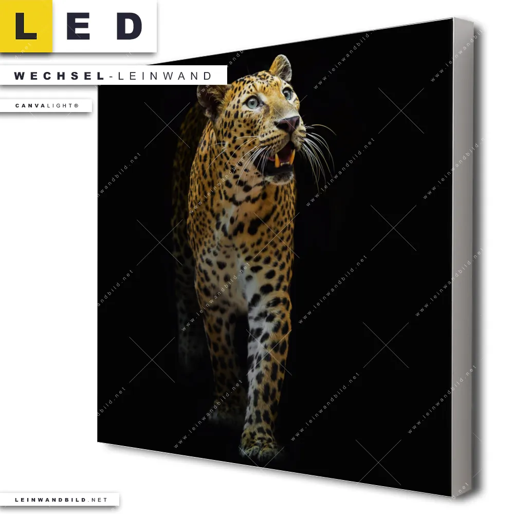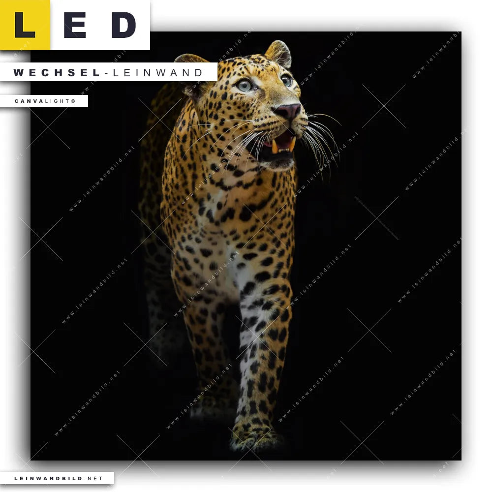 Du bist auf der Suche nach einer Tierwelt Wechsel-Leinwand für Dein LED-Leinwandbild im Quadratischen Format? Begriffe wie Raubkatze, Leopard, Afrika, Dschungel, Dunkelheit, Nacht haben Dich auf der Suche nach Deiner Ersatz-Leinwand für dein LED Wandbild mit wechselbarer Leinwand inspiriert? Farben wie Schwarz, Beige dürfen auf Deinem neuen Wechselmotiv für Dein XXL Leinwand-LED-Bild nicht fehlen und Leinwände im Natürlich - Realistisch Stil für Leuchtbilder passen perfekt zu Deinem Einrichtungsstil?