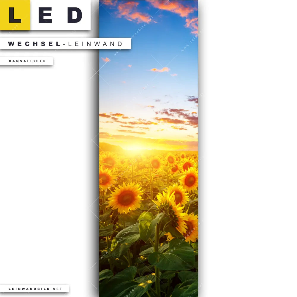 LED Wechsel-Leinwand Canvalight® TEX | Leuchtend gelbe Sonnenblumen am Abend | Schmal