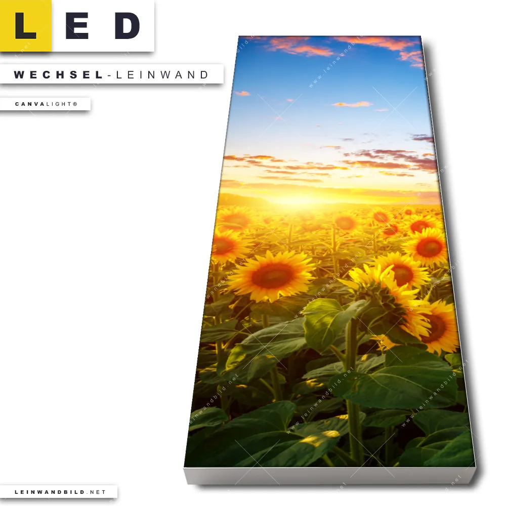 Du konfigurierst Deine individuelle LED Wechsel-Leinwand Canvalight® TEX | Leuchtend gelbe Sonnenblumen am Abend | Schmal und wir produzieren sie NEU für Dich. Unsere Landschaften, Blumen - Botanik Austausch-Fotoleinwände für Canvalight® LED Bilder sind KEINE Lagerware. Du bist Dir unsicher, welches Motiv oder Format das richtige für dein individuelles LED Wechselmotiv auf Leinwand ist, dann helfen wir dir gerne weiter und beraten dich!