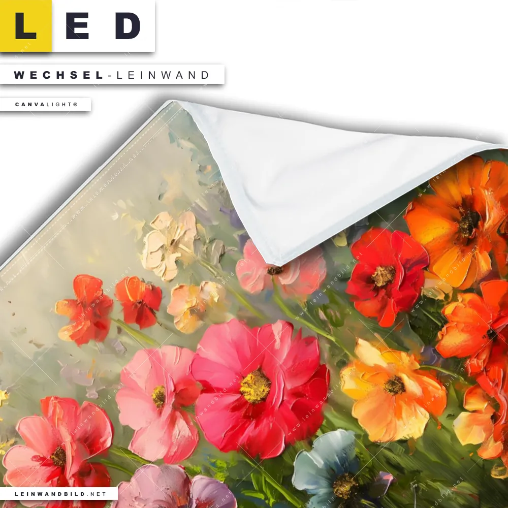 Dann sollte die Wechsel-Leinwand Canvalight® TEX | Leuchtende Frühlingsblumen | Quadrat den Weg zu Dir finden. Die Austausch-Leinwand Blumenwiese im Frühling - passend für unsere stufenlos dimmbaren, steckerfertigen Leinwandbilder im Leuchtrahmen mit Fernbedienung und optionaler Farbtemperatursteuerung - fügt sich als Eye-Catcher harmonisch in jedes Arzt - Praxis, Wohnzimmer - Schlafzimmer, Flur - Eingangsbereich Raumkonzept ein.