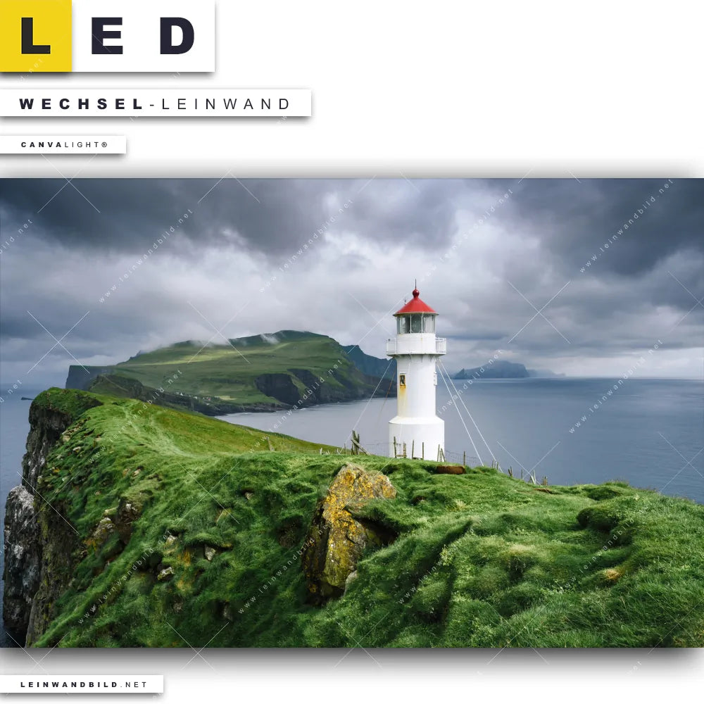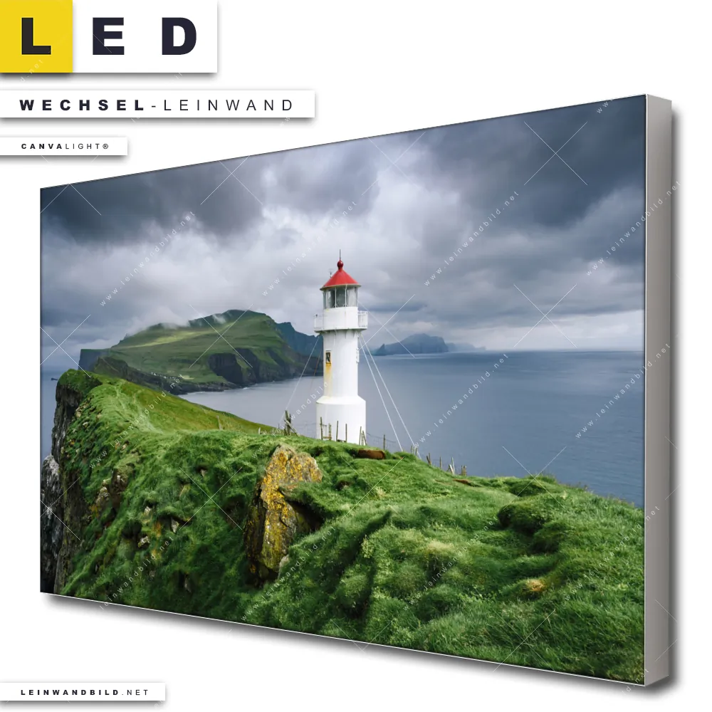 Auf der Suche nach Deinem neuen Wechselmotiv für LED Bilder mit austauschbarer Textil-Leinwand haben Dich Begriffe wie Leuchtturm, Landschaft, Natur, Küste, Färöer inspiriert? Dann sollte die Wechsel-Leinwand Leuchtturm an der Küste für Canvalight® TEX LED Leuchtbilder den Weg zu Dir finden.