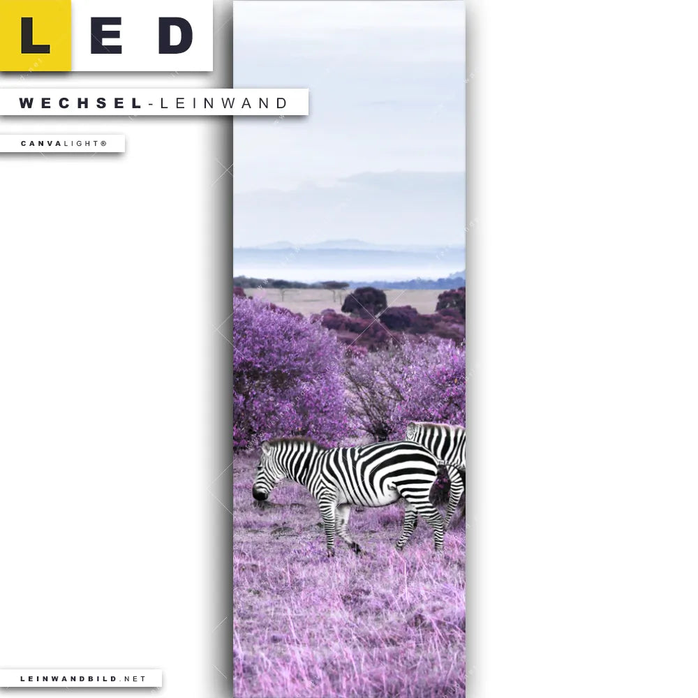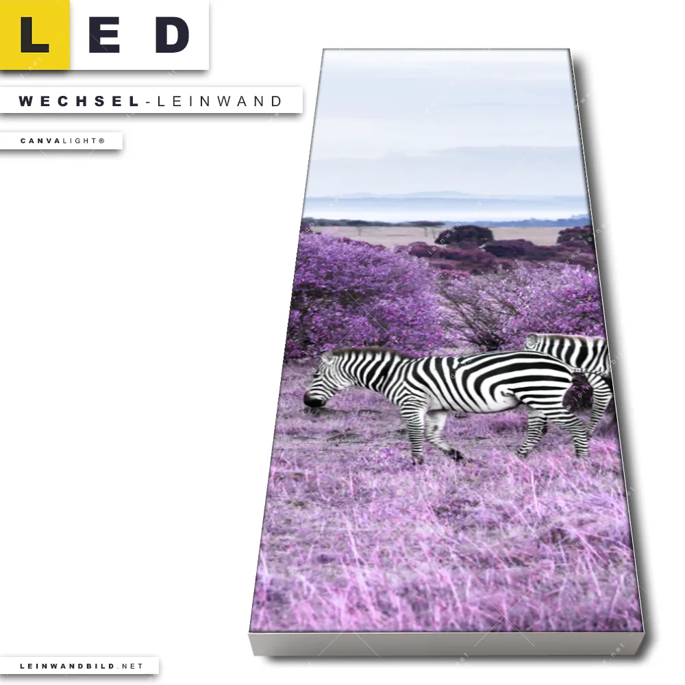 Du bist auf der Suche nach einer Tierwelt, Landschaften Wechsel-Leinwand für Dein LED-Leinwandbild im Schmalen Format? Begriffe wie Wald, Landschaft, Bäume, Natur, Afrika, Savanne, Zebra haben Dich auf der Suche nach Deiner Ersatz-Leinwand für dein LED Wandbild im Panorama-Hochformat mit wechselbarer Leinwand inspiriert? Farben wie Lila, Schwarz, Weiss, Hellblau dürfen auf Deinem neuen Wechselmotiv für Dein XXL Leinwand-LED-Bild nicht fehlen und Leinwände im Modern Art Stil für Leuchtbilder passen perfekt zu Deinem Einrichtungsstil?