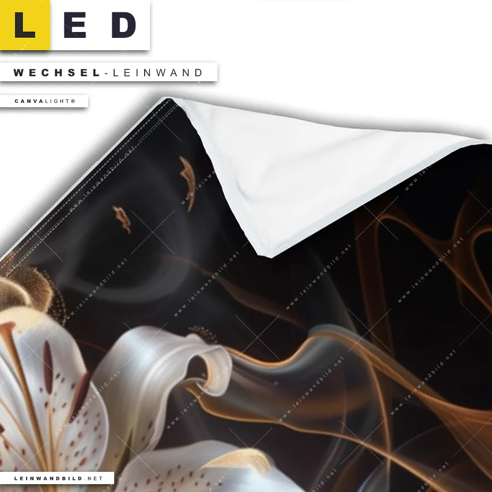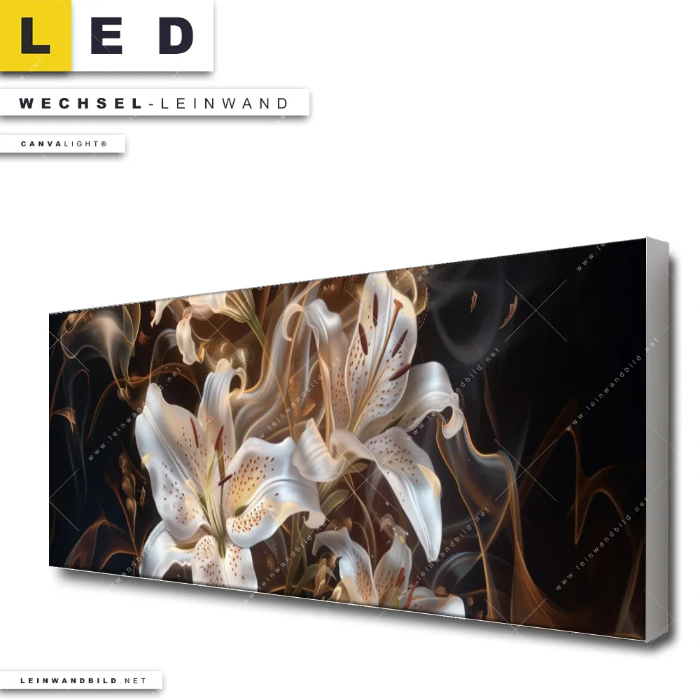 Du bist auf der Suche nach einer Blumen - Botanik Wechsel-Leinwand für Dein LED-Leinwandbild im Panorama-Format? Begriffe wie Lilien, Blüten, Blumen, Pflanze, Natur, Glitzer, Frühling, Rauch, Nebel haben Dich auf der Suche nach Deiner Ersatz-Leinwand für dein extra breites LED Wandbild mit wechselbarer Leinwand inspiriert? Farben wie Weiss, Schwarz, Gold dürfen auf Deinem neuen Wechselmotiv für Dein XXL Leinwand-LED-Bild nicht fehlen und Leinwände im Floral, Modern Art Stil für Leuchtbilder passen perfekt zu Deinem Einrichtungsstil?