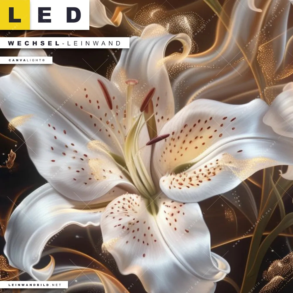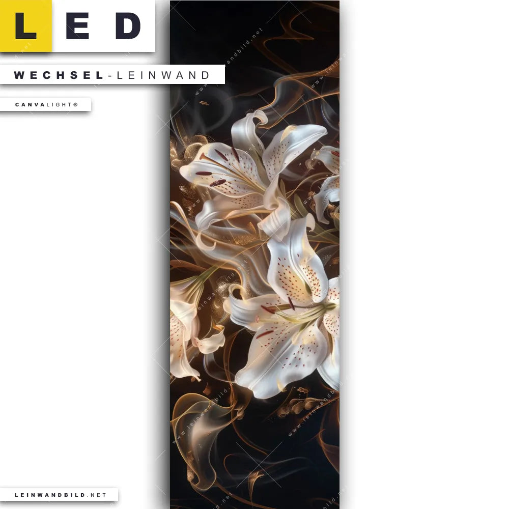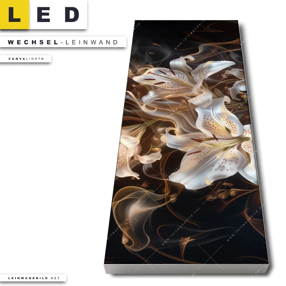 Du bist auf der Suche nach einer Blumen - Botanik Wechsel-Leinwand für Dein LED-Leinwandbild im Schmalen Format? Begriffe wie Lilien, Blüten, Blumen, Pflanze, Natur, Glitzer, Frühling, Rauch, Nebel haben Dich auf der Suche nach Deiner Ersatz-Leinwand für dein LED Wandbild im Panorama-Hochformat mit wechselbarer Leinwand inspiriert? Farben wie Weiss, Schwarz, Gold dürfen auf Deinem neuen Wechselmotiv für Dein XXL Leinwand-LED-Bild nicht fehlen und Leinwände im Floral, Modern Art Stil für Leuchtbilder passen perfekt zu Deinem Einrichtungsstil?