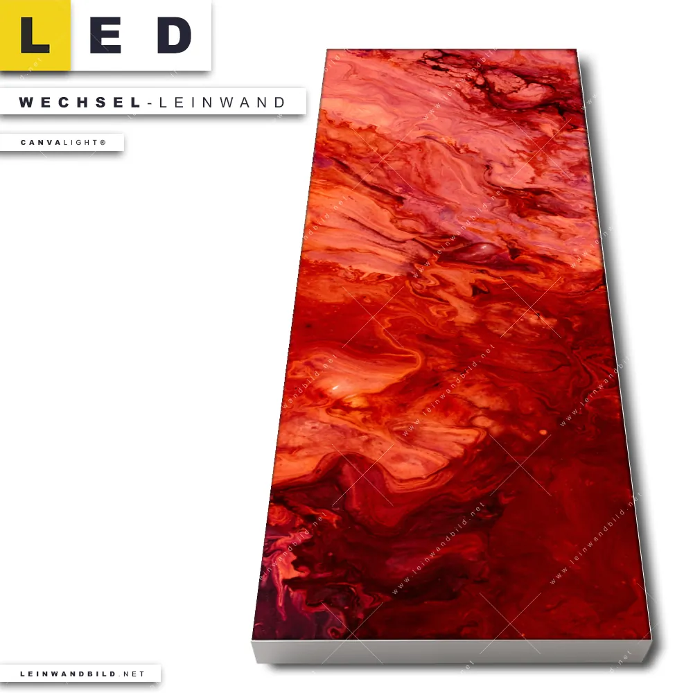 Du konfigurierst Deine individuelle LED Wechsel-Leinwand Canvalight® TEX | Liquid Marmor rot | Schmal und wir produzieren sie NEU für Dich. Unsere Muster - Texturen Austausch-Fotoleinwände für Canvalight® LED Bilder sind KEINE Lagerware. Du bist Dir unsicher, welches Motiv oder Format das richtige für dein individuelles LED Wechselmotiv auf Leinwand ist, dann helfen wir dir gerne weiter und beraten dich!
