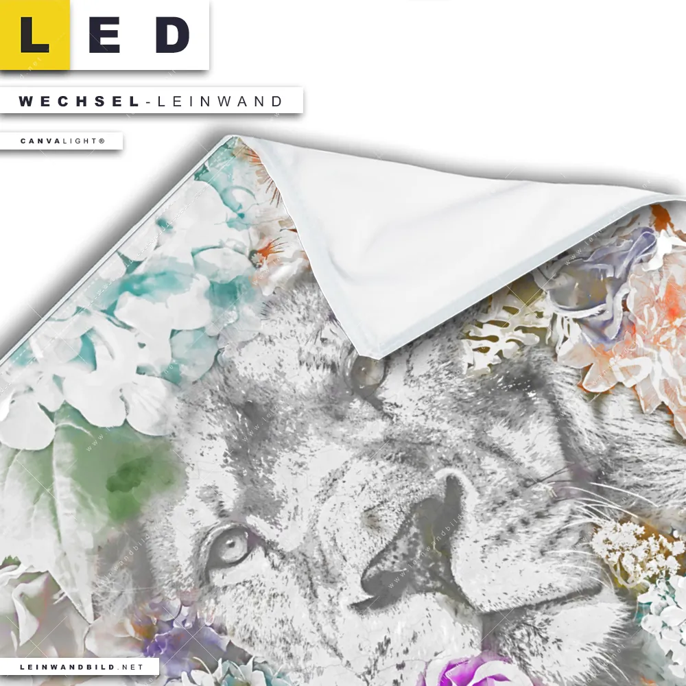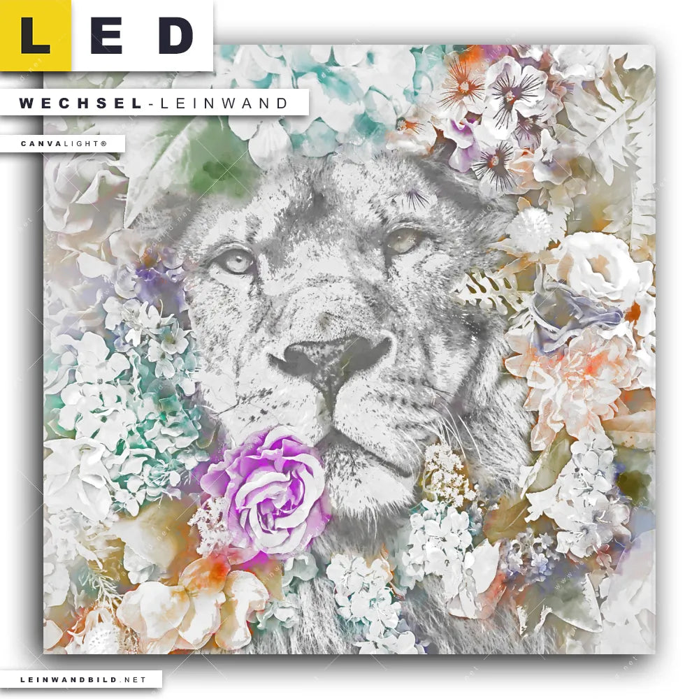 Du bist auf der Suche nach einer Tierwelt, Blumen - Botanik Wechsel-Leinwand für Dein LED-Leinwandbild im Quadratischen Format? Begriffe wie Tier, Blumen, Kunst, Aquarell, Löwe, Lion, Raubkatze, Blüten haben Dich auf der Suche nach Deiner Ersatz-Leinwand für dein LED Wandbild mit wechselbarer Leinwand inspiriert? Farben wie Rosa, Pink, Weiss, Grau , Grün, Gold, Orange, Braun, Beige dürfen auf Deinem neuen Wechselmotiv für Dein XXL Leinwand-LED-Bild nicht fehlen und Leinwände im Floral, Modern Art Stil für Leuchtbilder passen perfekt zu Deinem Einrichtungsstil?