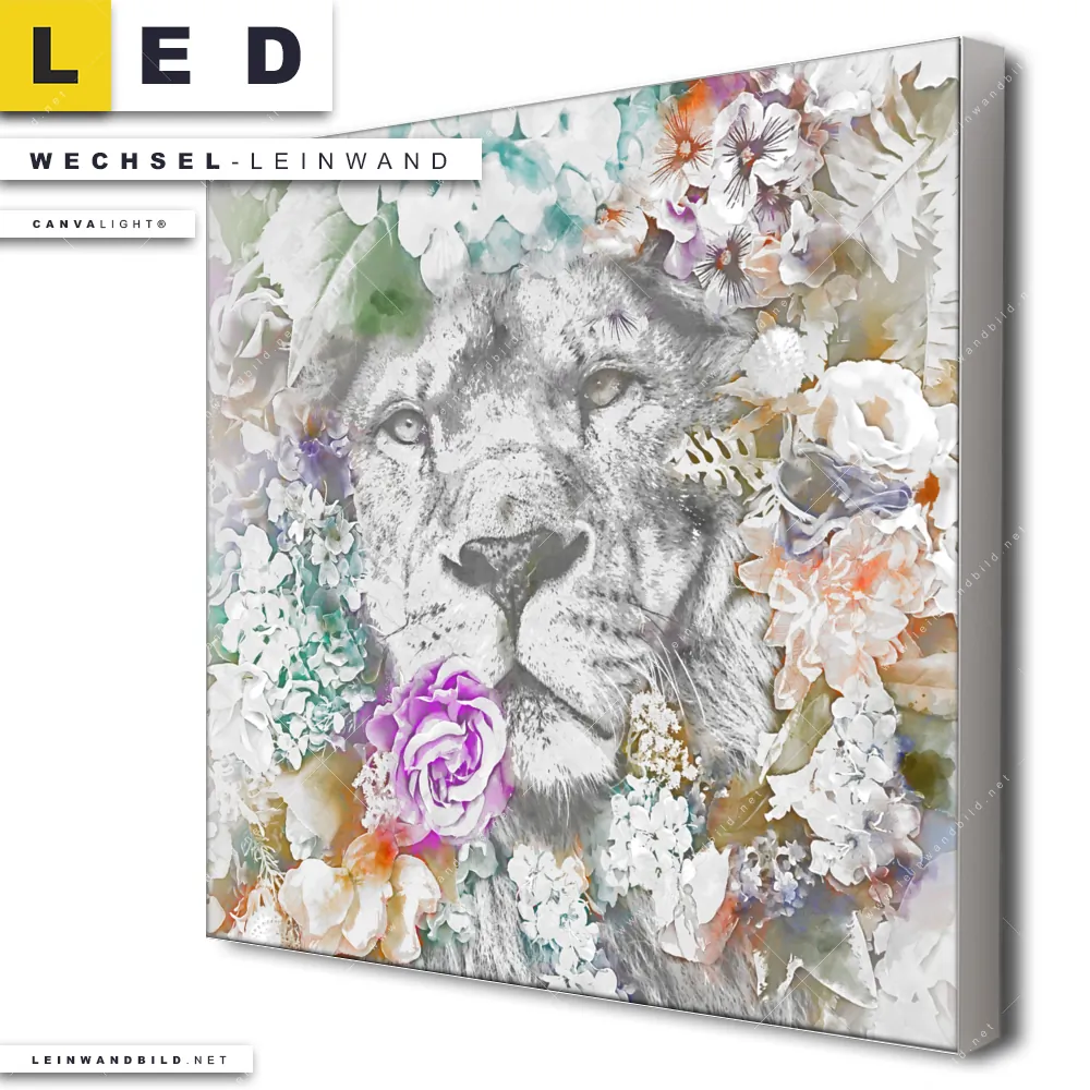 Dann sollte die Wechsel-Leinwand Canvalight® TEX | Löwe & Blumen | Quadrat den Weg zu Dir finden. Die Austausch-Leinwand Löwenporträt aus pastellfarbenen Blumen - passend für unsere stufenlos dimmbaren, steckerfertigen Leinwandbilder im Leuchtrahmen mit Fernbedienung und optionaler Farbtemperatursteuerung - fügt sich als Eye-Catcher harmonisch in jedes Wohnzimmer - Schlafzimmer, Arzt - Praxis, Bar - Gastronomie, Badezimmer, Büro - Kanzlei, Flur - Eingangsbereich Raumkonzept ein.