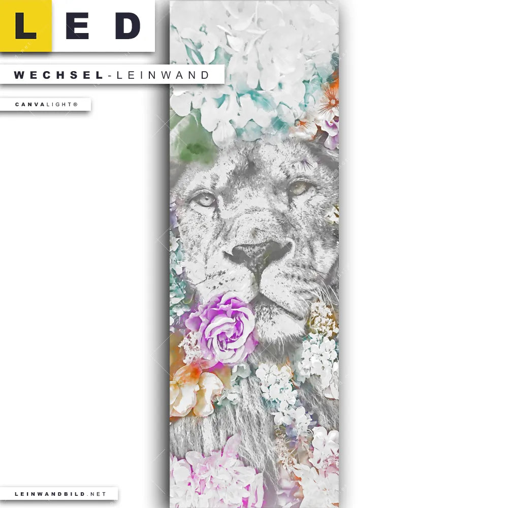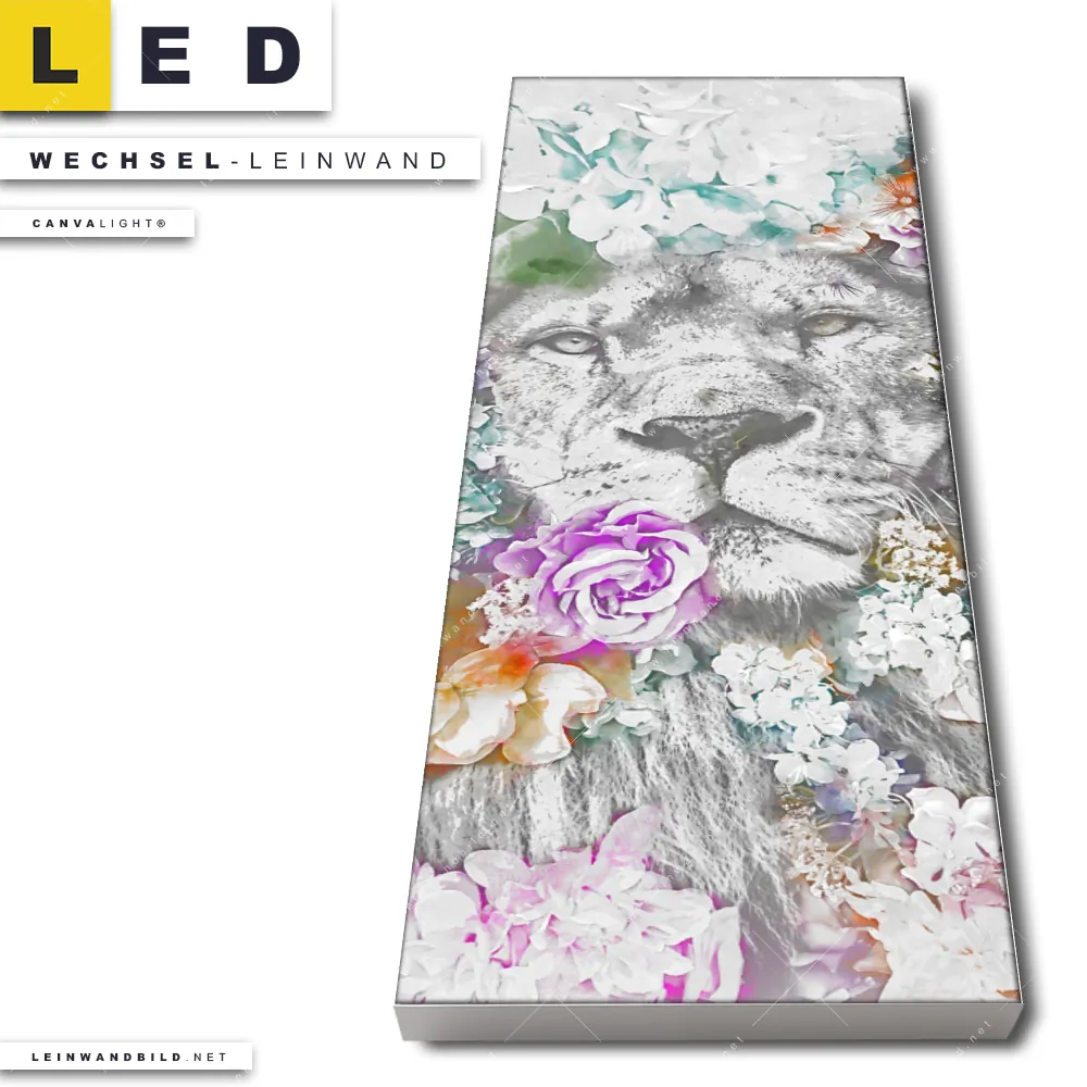 Dann sollte die Wechsel-Leinwand Canvalight® TEX | Löwe & Blumen | Schmal den Weg zu Dir finden. Die Austausch-Leinwand Löwe umrahmt von Aquarellblüten - passend für unsere stufenlos dimmbaren, steckerfertigen Leinwandbilder im LED Leuchtrahmen mit Fernbedienung und optionaler Farbtemperatursteuerung - fügt sich als Eye-Catcher harmonisch in jedes Wohnzimmer - Schlafzimmer, Arzt - Praxis, Bar - Gastronomie, Badezimmer, Büro - Kanzlei, Flur - Eingangsbereich Raumkonzept ein.