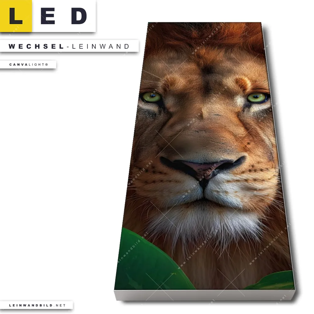 Du konfigurierst Deine individuelle LED Wechsel-Leinwand Canvalight® TEX | Löwe im grünen Regenwald | Schmal und wir produzieren sie NEU für Dich. Unsere Tierwelt, Blumen - Botanik Austausch-Fotoleinwände für Canvalight® LED Bilder sind KEINE Lagerware. Du bist Dir unsicher, welches Motiv oder Format das richtige für dein individuelles LED Wechselmotiv auf Leinwand ist, dann helfen wir dir gerne weiter und beraten dich!