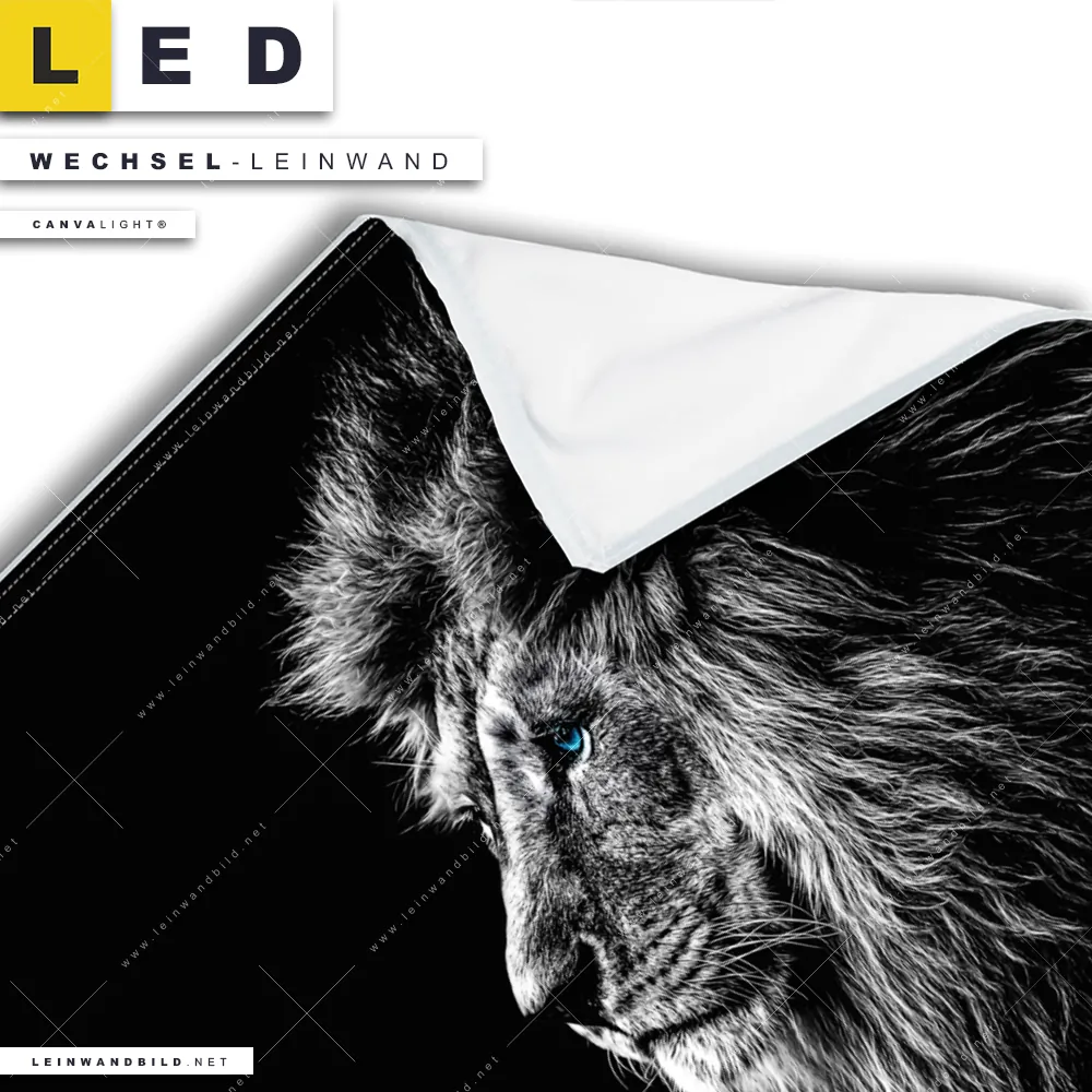 Dann sollte die Wechsel-Leinwand Canvalight® TEX | Löwe mit blauen Augen | Quadrat den Weg zu Dir finden. Die Austausch-Leinwand Löwenkopf schwarz-weiß - passend für unsere stufenlos dimmbaren, steckerfertigen Leinwandbilder im Leuchtrahmen mit Fernbedienung und optionaler Farbtemperatursteuerung - fügt sich als Eye-Catcher harmonisch in jedes Arzt - Praxis, Bar - Gastronomie, Büro - Kanzlei, Flur - Eingangsbereich, Wohnzimmer - Schlafzimmer Raumkonzept ein.