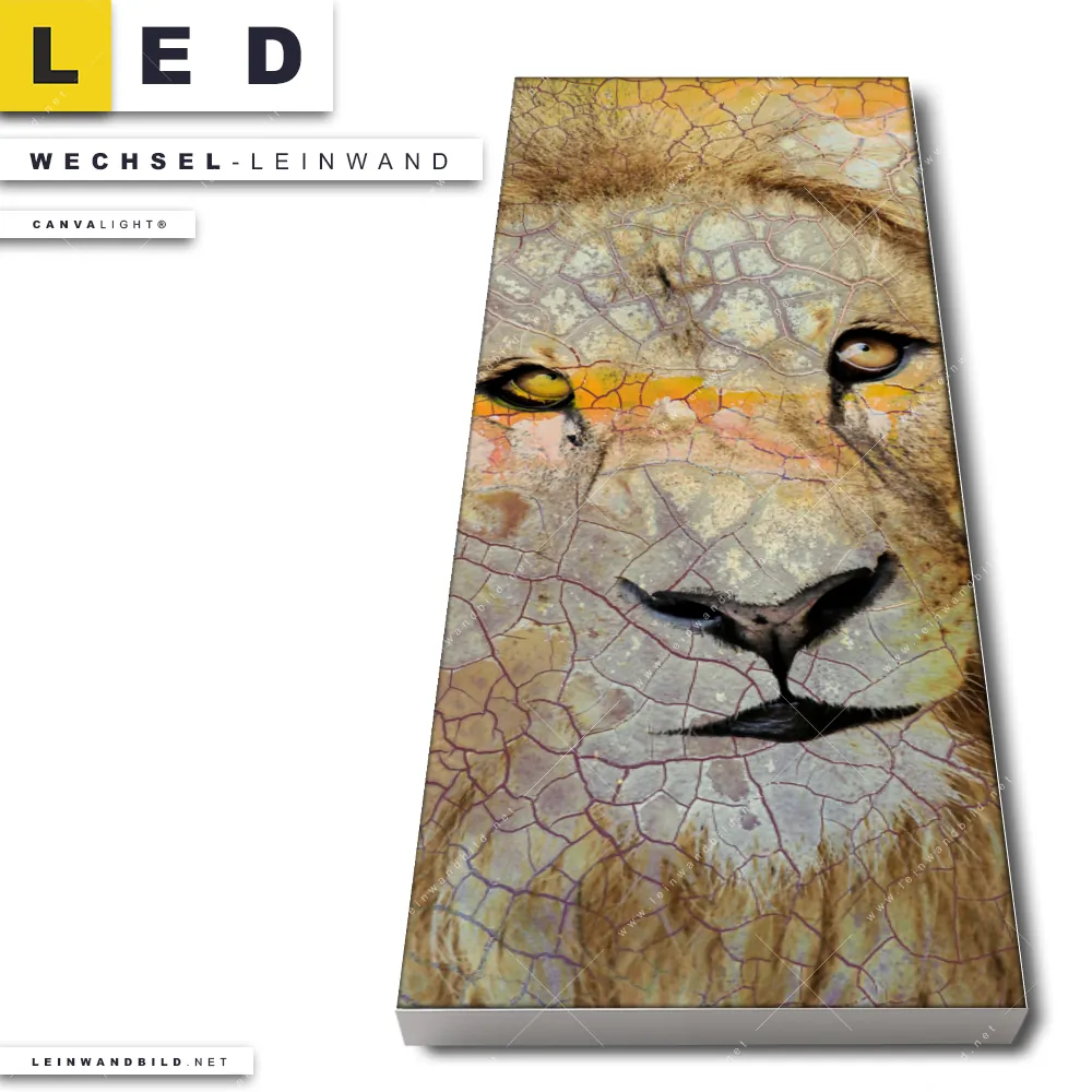 Du bist auf der Suche nach einer Tierwelt Wechsel-Leinwand für Dein LED-Leinwandbild im Schmalen Format? Begriffe wie Tier, Grunge, Streetart, modern, Afrika, Löwe, Lion, Raubkatze haben Dich auf der Suche nach Deiner Ersatz-Leinwand für dein LED Wandbild im Panorama-Hochformat mit wechselbarer Leinwand inspiriert? Farben wie Beige, Orange dürfen auf Deinem neuen Wechselmotiv für Dein XXL Leinwand-LED-Bild nicht fehlen und Leinwände im Grunge, Mixed Media, Modern Art, Retro - Vintage Stil für Leuchtbilder passen perfekt zu Deinem Einrichtungsstil?