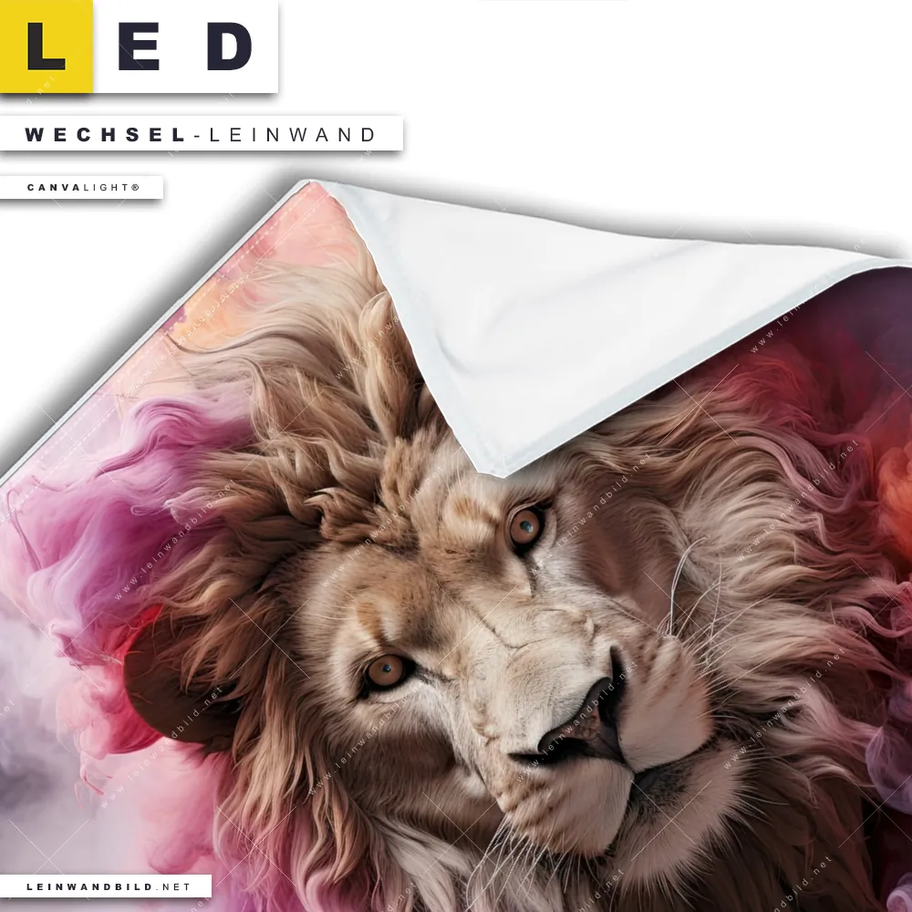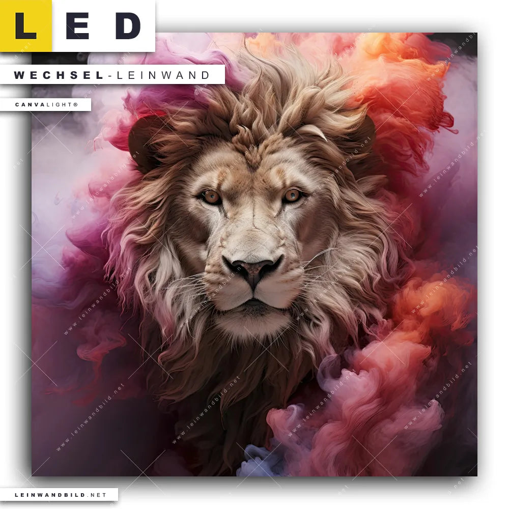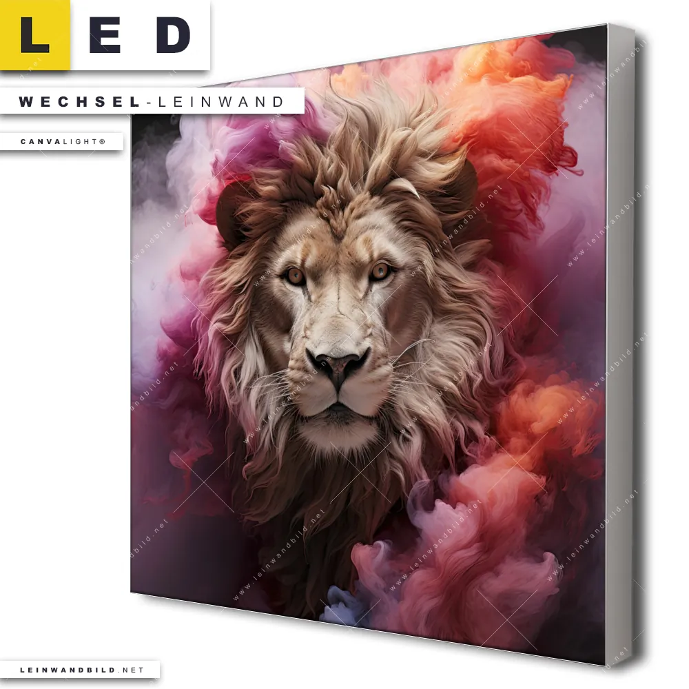 Du bist auf der Suche nach einer Tierwelt Wechsel-Leinwand für Dein LED-Leinwandbild im Quadratischen Format? Begriffe wie Raubkatze, Löwe, Afrika, Dschungel, Lion, Rauch, Qualm, Wolken, Farbexplosion, Porträt haben Dich auf der Suche nach Deiner Ersatz-Leinwand für dein LED Wandbild mit wechselbarer Leinwand inspiriert? Farben wie Beige, Pink, Rot dürfen auf Deinem neuen Wechselmotiv für Dein XXL Leinwand-LED-Bild nicht fehlen und Leinwände im Modern Art, Abstrakt Stil für Leuchtbilder passen perfekt zu Deinem Einrichtungsstil?