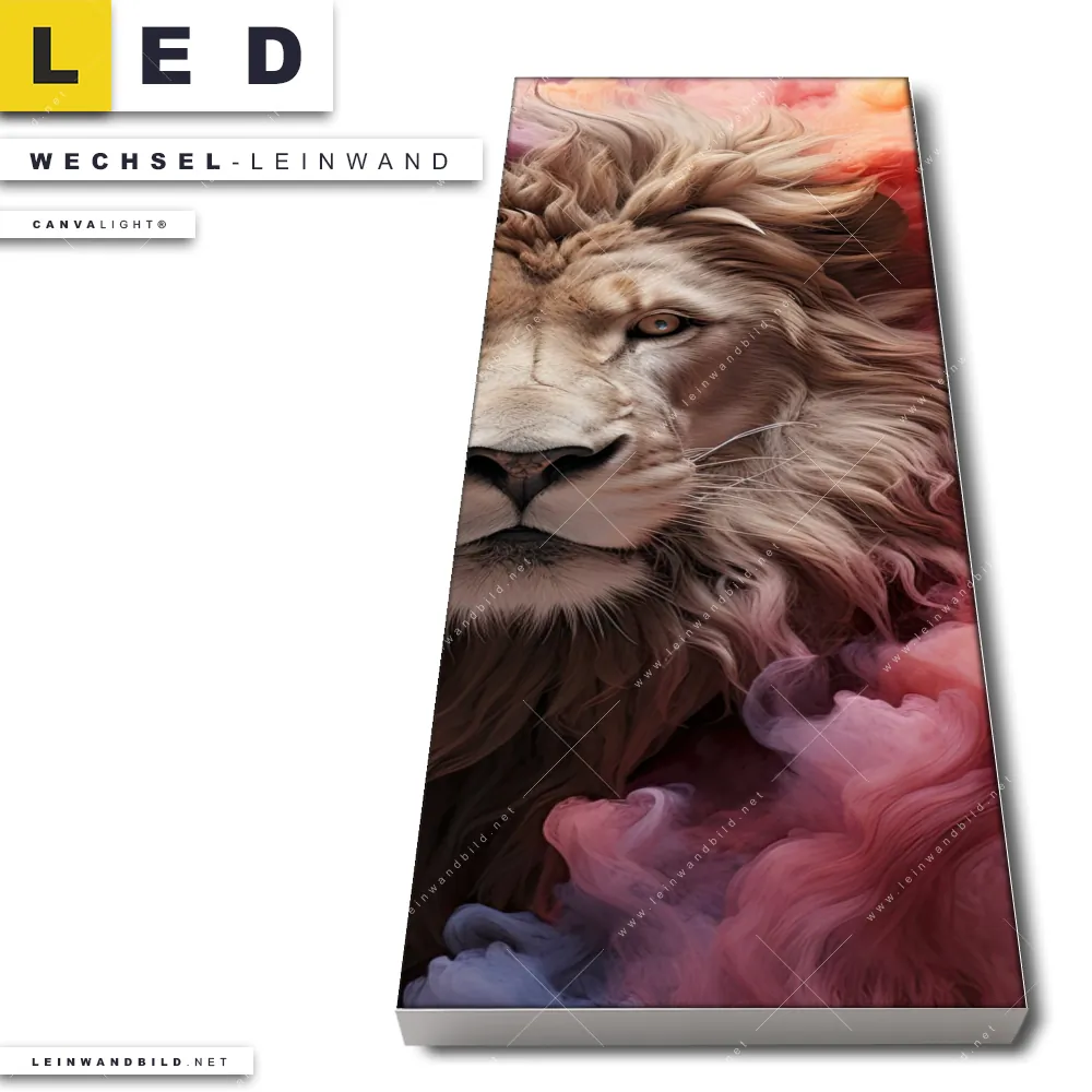 LED Wechsel-Leinwand Canvalight® TEX | Löwengesicht in buntem Rauch | Schmal