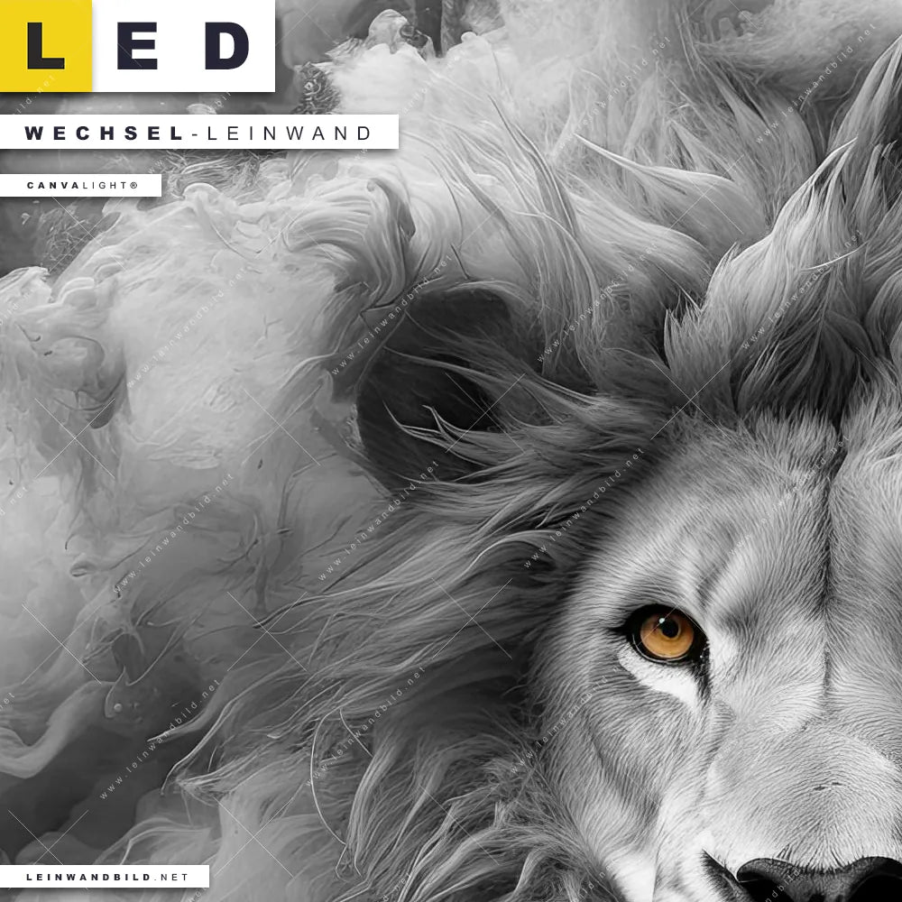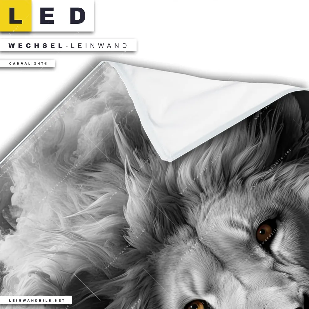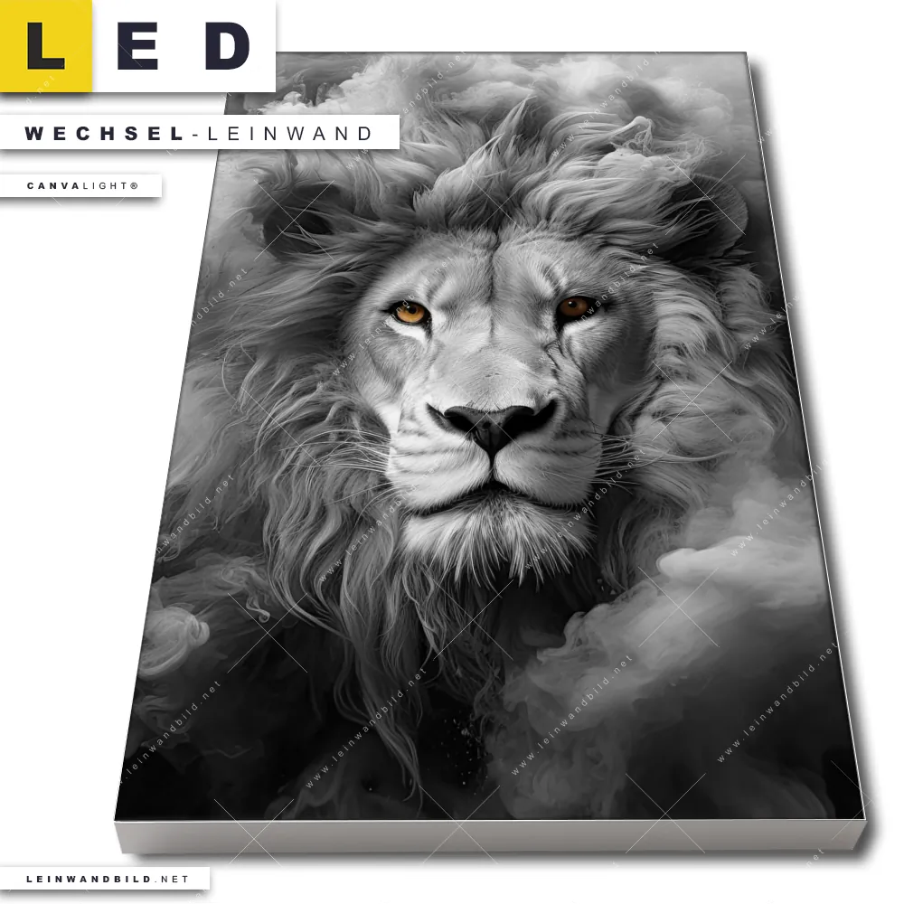 Du bist auf der Suche nach einer Tierwelt Wechsel-Leinwand für Dein LED-Leinwandbild im Hochformat? Begriffe wie Raubkatze, Löwe, Afrika, Dschungel, Lion, Rauch, Qualm, Wolken, Porträt haben Dich auf der Suche nach Deiner Ersatz-Leinwand für dein LED Wandbild mit wechselbarer Leinwand inspiriert? Farben wie Weiss, Schwarz, Grau dürfen auf Deinem neuen Wechselmotiv für Dein XXL Leinwand-LED-Bild nicht fehlen und Leinwände im Modern Art, Schwarz - Weiss Stil für Leuchtbilder passen perfekt zu Deinem Einrichtungsstil?