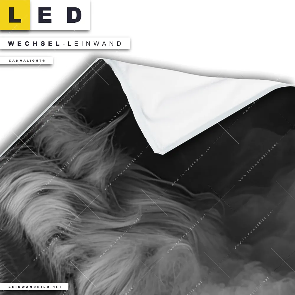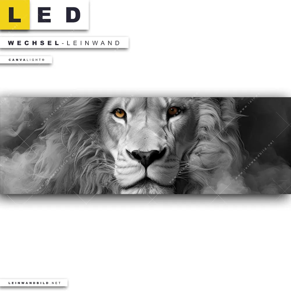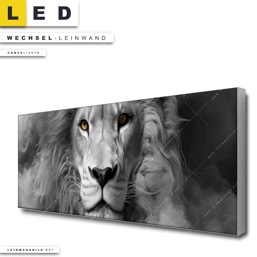 Du bist auf der Suche nach einer Tierwelt Wechsel-Leinwand für Dein LED-Leinwandbild im Panorama-Format? Begriffe wie Raubkatze, Löwe, Afrika, Dschungel, Lion, Rauch, Qualm, Wolken, Porträt haben Dich auf der Suche nach Deiner Ersatz-Leinwand für dein extra breites LED Wandbild mit wechselbarer Leinwand inspiriert? Farben wie Weiss, Schwarz, Grau dürfen auf Deinem neuen Wechselmotiv für Dein XXL Leinwand-LED-Bild nicht fehlen und Leinwände im Modern Art, Schwarz - Weiss Stil für Leuchtbilder passen perfekt zu Deinem Einrichtungsstil?