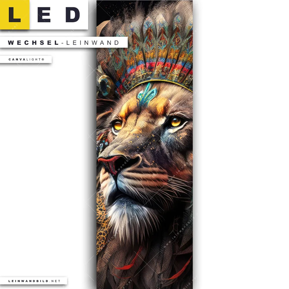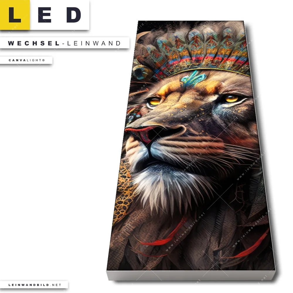 Du bist auf der Suche nach einer Tierwelt Wechsel-Leinwand für Dein LED-Leinwandbild im Schmalen Format? Begriffe wie Raubkatze, Löwe, Afrika, Dschungel, Lion, Federn, Indianer, Häuptling, Kopfschmuck, Porträt haben Dich auf der Suche nach Deiner Ersatz-Leinwand für dein LED Wandbild im Panorama-Hochformat mit wechselbarer Leinwand inspiriert? Farben wie Schwarz, Bunt dürfen auf Deinem neuen Wechselmotiv für Dein XXL Leinwand-LED-Bild nicht fehlen und Leinwände im Modern Art Stil für Leuchtbilder passen perfekt zu Deinem Einrichtungsstil?