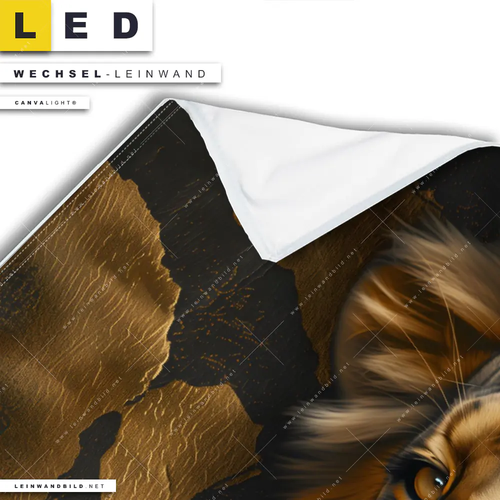 LED Wechsel-Leinwand Canvalight® TEX | Löwenportrait: Kraft und Eleganz | Hochformat