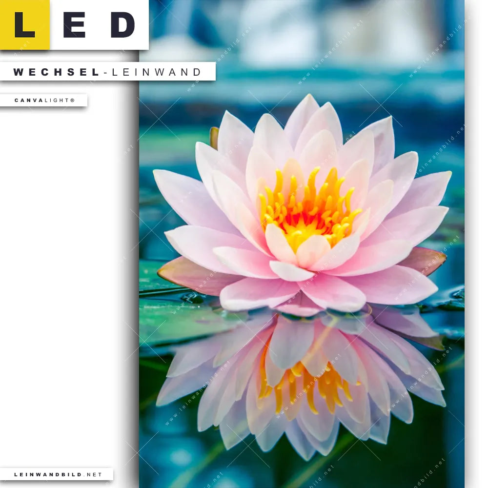 Dann sollte die Wechsel-Leinwand Canvalight® TEX | Lotusblume | Hochformat den Weg zu Dir finden. Die Austausch-Leinwand Seerose mit Wasserspiegelung - passend für unsere stufenlos dimmbaren, steckerfertigen Leinwandbilder im Leuchtrahmen mit Fernbedienung und optionaler Farbtemperatursteuerung - fügt sich als Eye-Catcher harmonisch in jedes Arzt - Praxis, Badezimmer, Flur - Eingangsbereich, Küche - Esszimmer, Wohnzimmer - Schlafzimmer Raumkonzept ein.