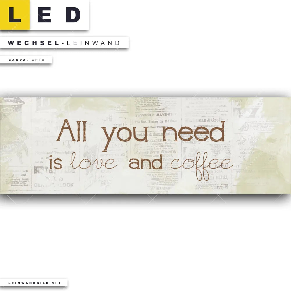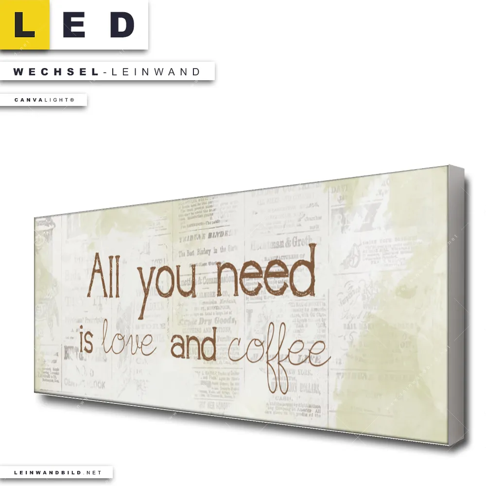 Du bist auf der Suche nach einer Essen - Trinken Wechsel-Leinwand für Dein LED-Leinwandbild im Panorama-Format? Begriffe wie Kaffee, Coffee, Motivation, Küche, Kaffebohnen, Spruch, Liebe haben Dich auf der Suche nach Deiner Ersatz-Leinwand für dein extra breites LED Wandbild mit wechselbarer Leinwand inspiriert? Farben wie Braun, Beige dürfen auf Deinem neuen Wechselmotiv für Dein XXL Leinwand-LED-Bild nicht fehlen und Leinwände im Retro - Vintage, Mixed Media Stil für Leuchtbilder passen perfekt zu Deinem Einrichtungsstil?