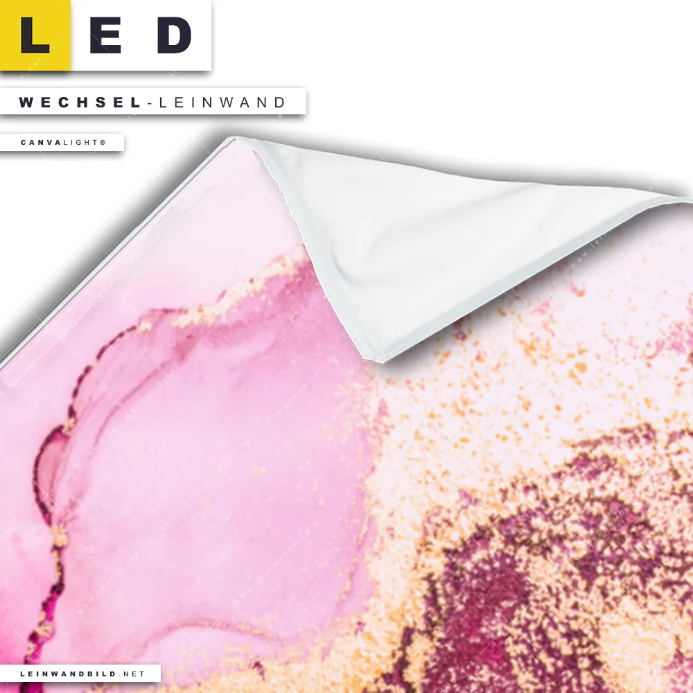 Dann sollte die Wechsel-Leinwand Canvalight® TEX | Luxury Abstract Fluid Art No. 7 | Panorama den Weg zu Dir finden. Die Austausch-Leinwand Marmordesign pink-gold - passend für unsere stufenlos dimmbaren, steckerfertigen Leinwandbilder im LED Leuchtrahmen mit Fernbedienung und optionaler Farbtemperatursteuerung - fügt sich als Eye-Catcher harmonisch in jedes Arzt - Praxis, Büro - Kanzlei, Wohnzimmer - Schlafzimmer, Bar - Gastronomie, Friseur - Beauty Raumkonzept ein.