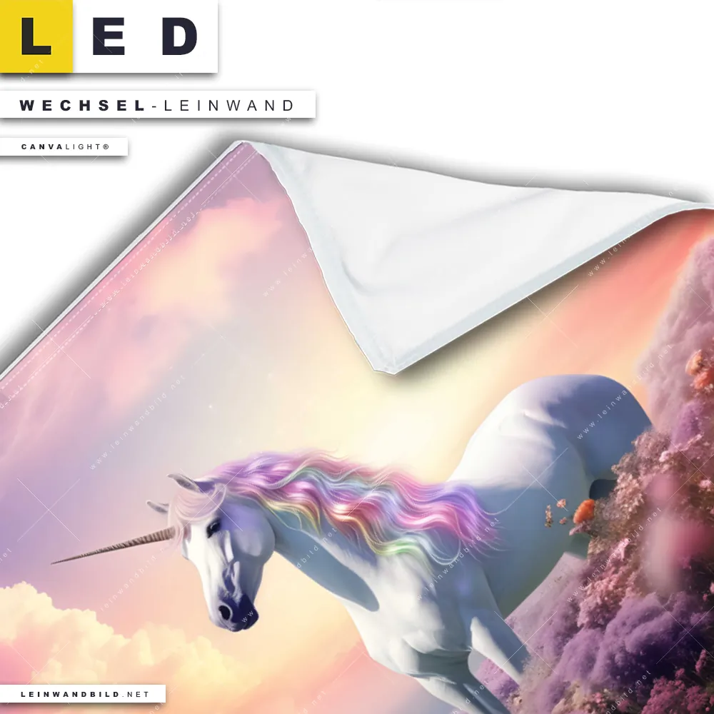 Du bist auf der Suche nach einer Tierwelt Wechsel-Leinwand für Dein LED-Leinwandbild im Querformat? Begriffe wie Kinder, Tiere, Freunde, Nachtlicht, träumen, Einhorn, Pegasus, Regenbogenfarben, Fantasy haben Dich auf der Suche nach Deiner Ersatz-Leinwand für dein breites LED Wandbild mit wechselbarer Leinwand inspiriert? Farben wie Blau, Pink, Weiss, Lila dürfen auf Deinem neuen Wechselmotiv für Dein XXL Leinwand-LED-Bild nicht fehlen und Leinwände im Surreal - Fantasy Stil für Leuchtbilder passen perfekt zu Deinem Einrichtungsstil?