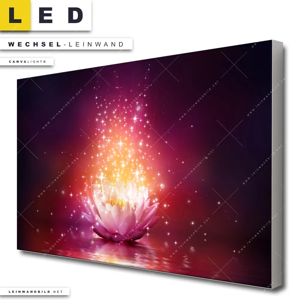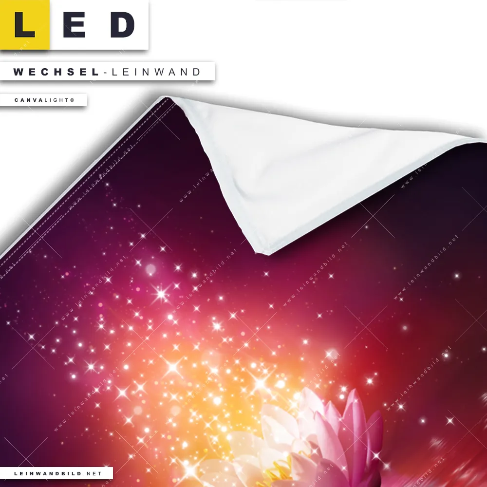 Dann sollte die Wechsel-Leinwand Canvalight® TEX | Magie Blume | Querformat den Weg zu Dir finden. Die Austausch-Leinwand magische Blüte - passend für unsere stufenlos dimmbaren, steckerfertigen Leinwandbilder im Leuchtrahmen mit Fernbedienung und optionaler Farbtemperatursteuerung - fügt sich als Eye-Catcher harmonisch in jedes Arzt - Praxis, Wohnzimmer - Schlafzimmer, Friseur - Beauty Raumkonzept ein.