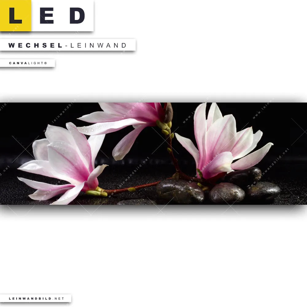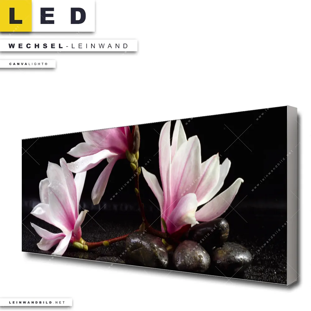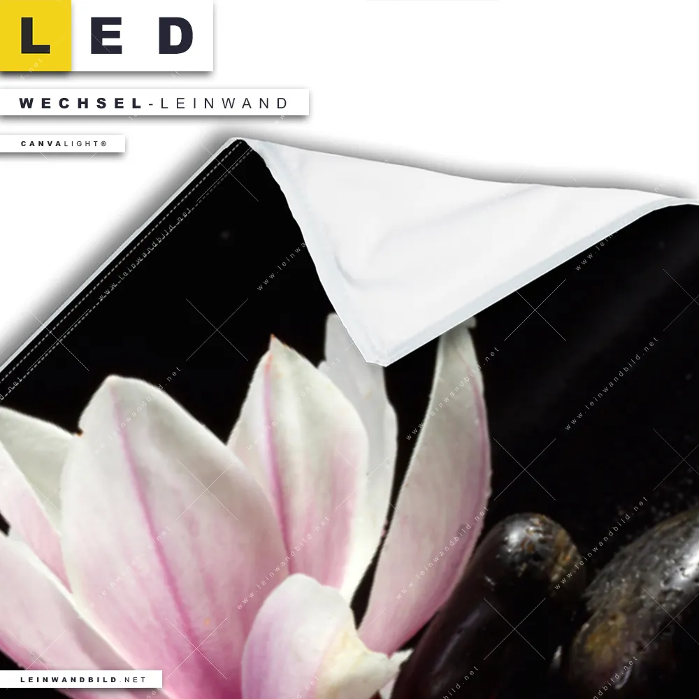 Du konfigurierst Deine individuelle LED Wechsel-Leinwand Canvalight® TEX | Magnolien & Zen Steine | Panorama und wir produzieren sie NEU für Dich. Unsere Blumen - Botanik, Buddha - Feng Shui Austausch-Fotoleinwände für Canvalight® LED Bilder sind KEINE Lagerware. Du bist Dir unsicher, welches Motiv oder Format das richtige für dein individuelles LED Wechselmotiv auf Leinwand ist, dann helfen wir dir gerne weiter und beraten dich!